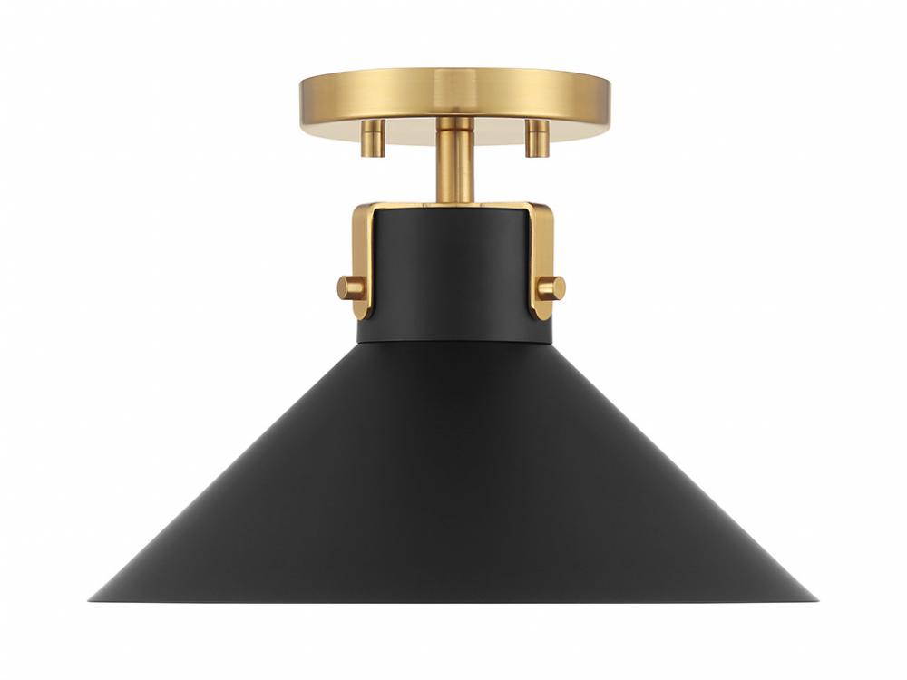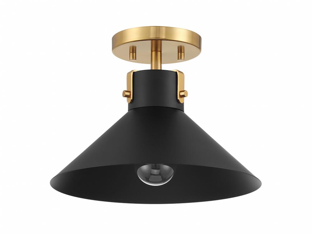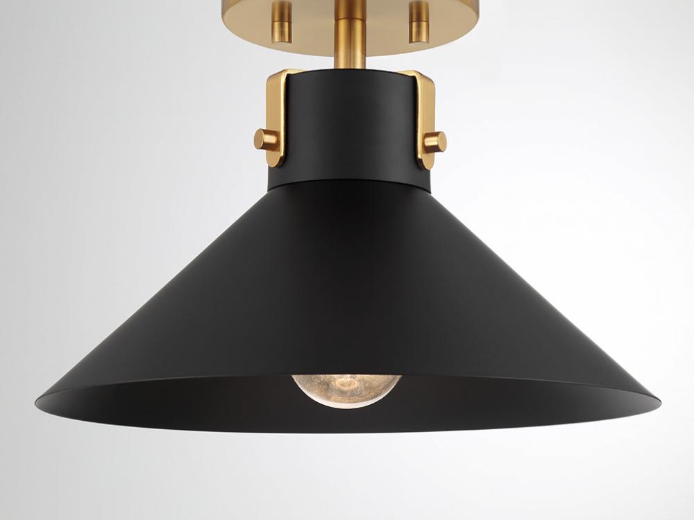 This 1-light ceiling semi-flush mount offers up big style in a small package. Brightening up any room, even cozier spaces like closets and laundry rooms, is a snap with this crisp combination of a metal shade finished in Matte Black and hardware finished in Natural Brass. The opaque shade will concentrate and direct the light. This fixture is 8" in height and 11.5" in width. It uses 1 standard size bulb of up to 60 watts. Bulb not included.