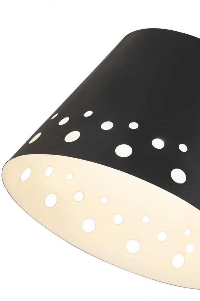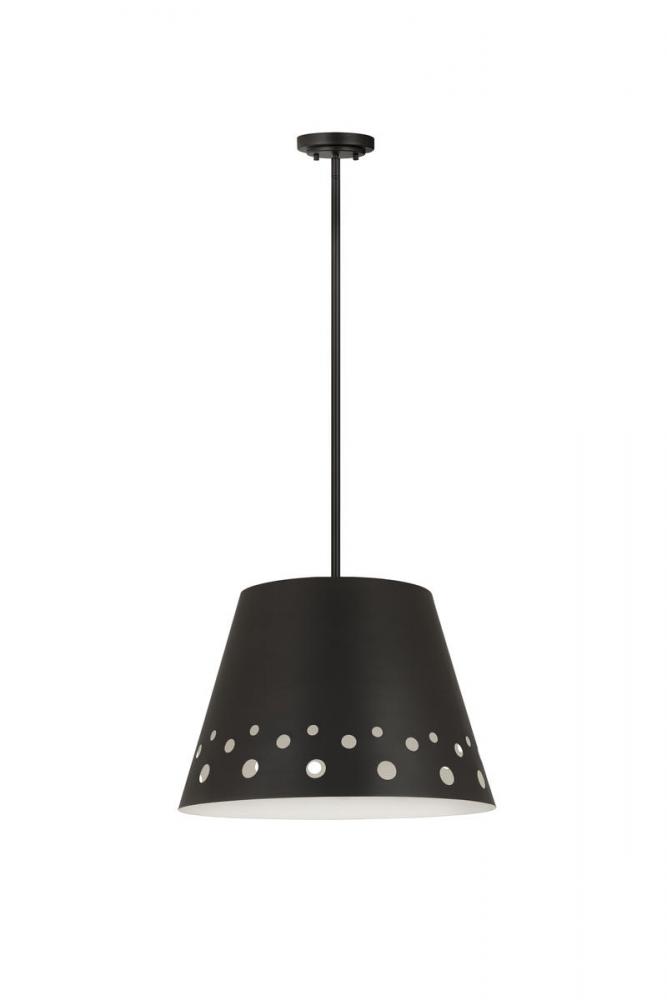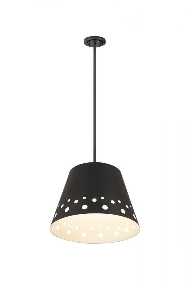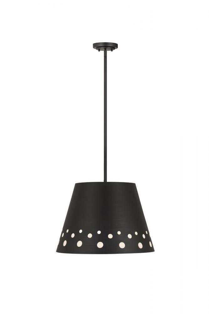 Cheery circles of various sizes dot the conical shade of this stylish pendant from the Katie collection. Perfect for casual spaces, this pendant showcases construction of matte black finish iron with a matching down rod and canopy. Highlight any modern space with this light that features adjustable height placement and is suitable for sloped ceilings.