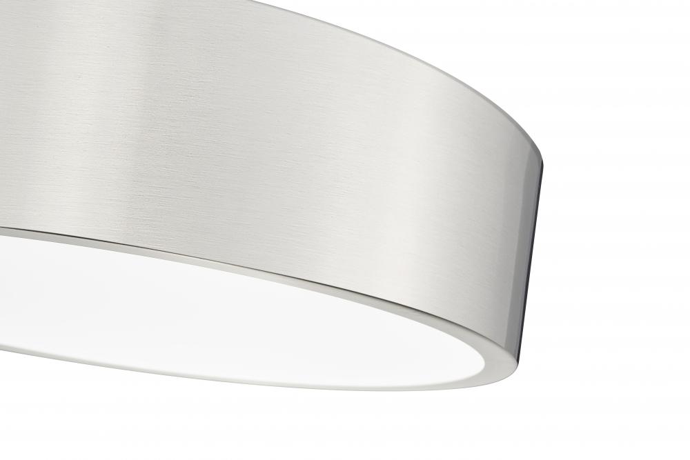 Simple and sleek, this modern flush mount LED ceiling light has a halo-like silhouette with a thick steel frame with a smooth texture and inviting brushed nickel finish. A frosted diffuser conceals a dimmable, energy efficient LED light source thats great for ambiance and tasks in your bedroom, den, or living area.