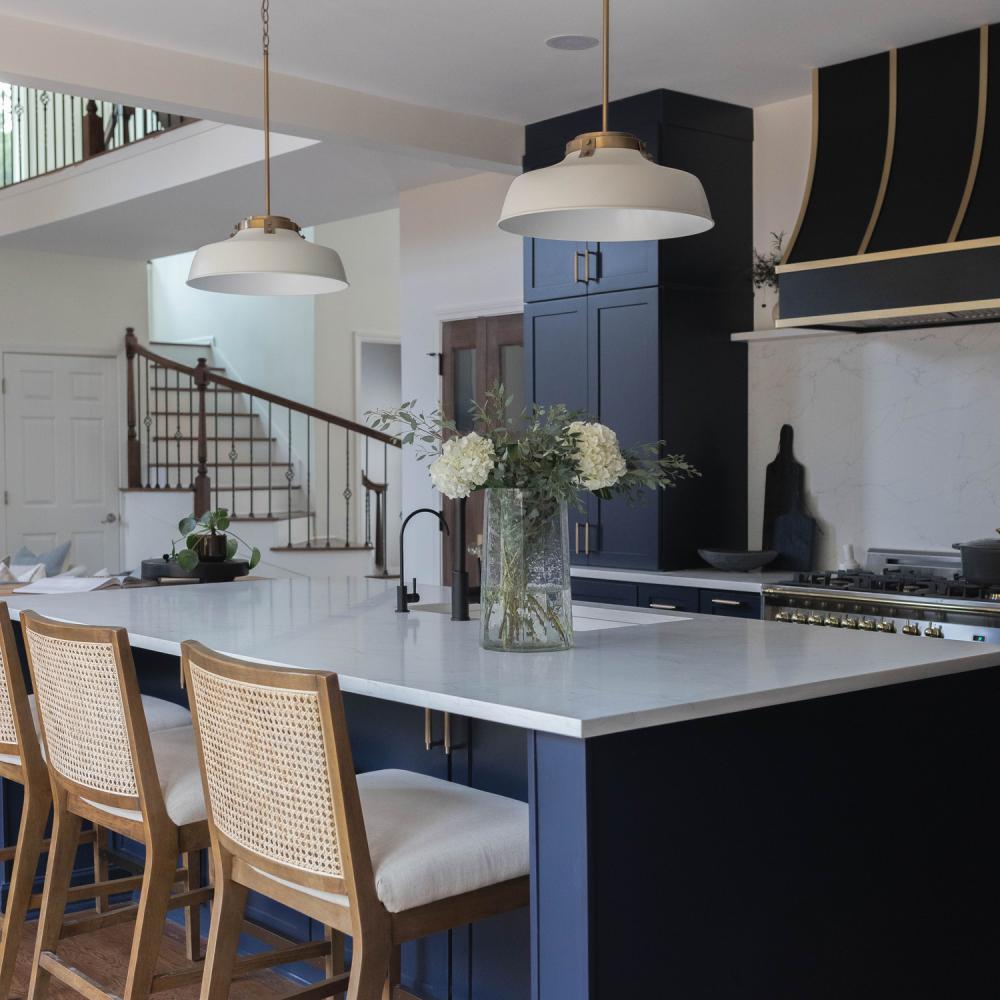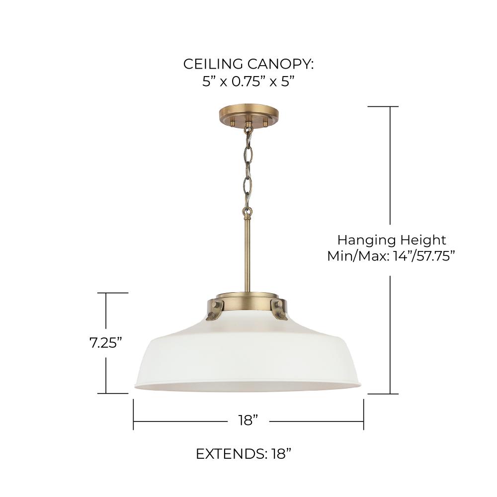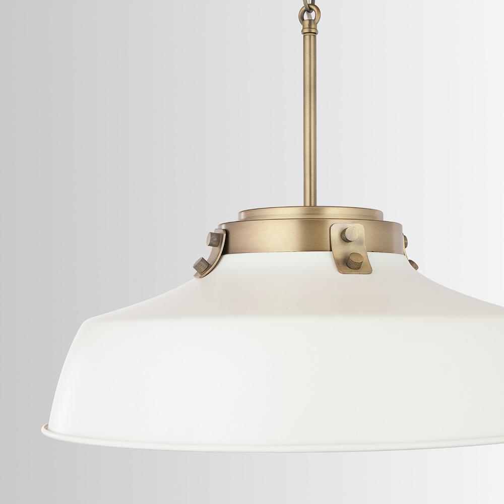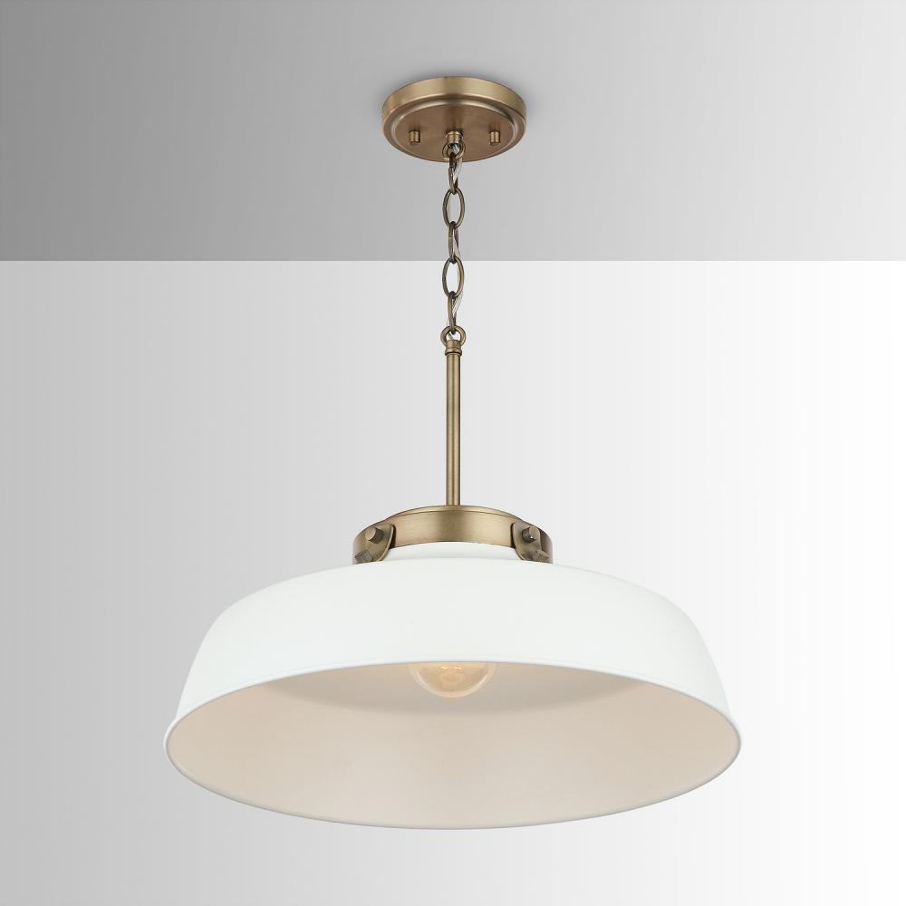 Industrial style meets farmhouse chic in the Oakwood Pendant. The Aged Brass hardware paired with the Matte White metal shade brings a modern mixed-metal aesthetic to any space.