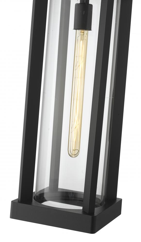 Sleek and modern, the open frame makes a stunning statement for your home. A cylindrical shade of clear glass casts a bright and radiant glow. Available in black finish.
