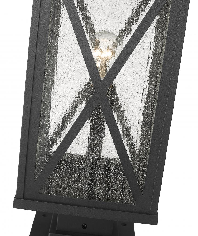 This one-light outdoor pier mounted fixture has a square, tiered base, and comes in a box-shaped black aluminum cage with a clear seedy glass finish. It softly diffuses light to provide a welcoming glow to your front entrance or patio. Compelling X-accents bring dimension and character.