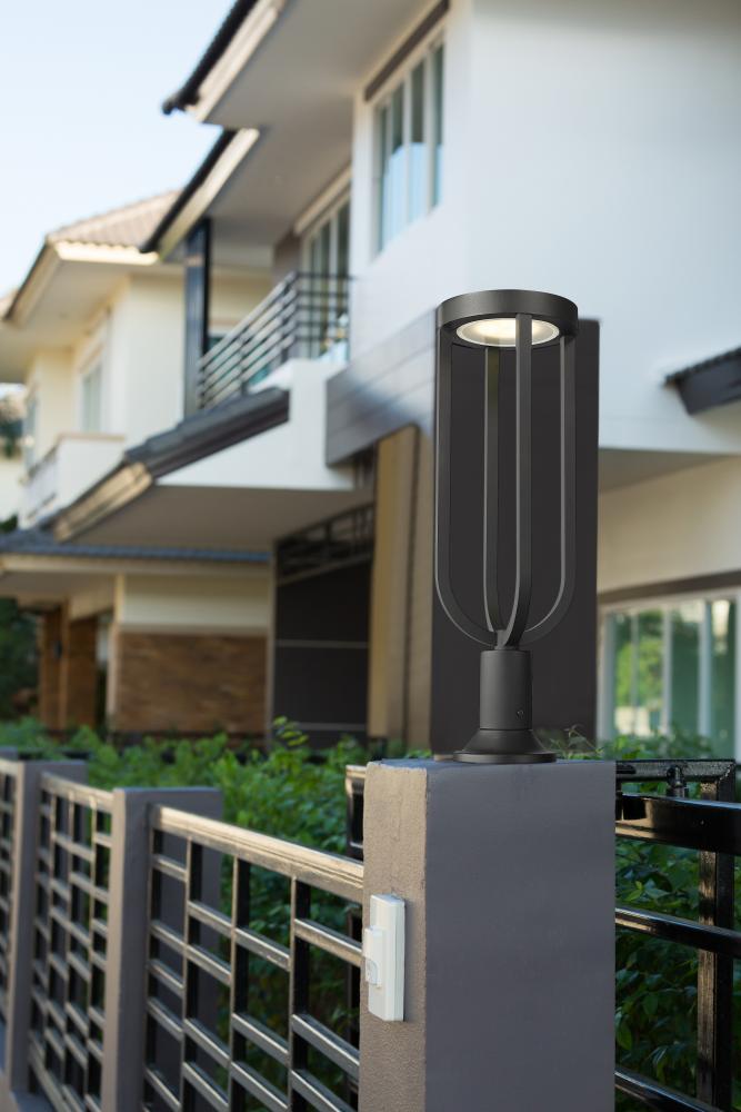 This modern one-light outdoor post mount fixture sets the tone on your deck or patio with its eye-catching profile and selectable color temperature. Perfect for railings, stairs, and more, the light features an energy efficient LED and a sand black finish for marine-grade durability, all complementing a sleek silhouette that includes an open cage lantern with a teardrop shape that adds graceful elegance.