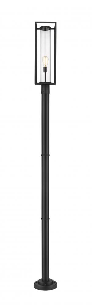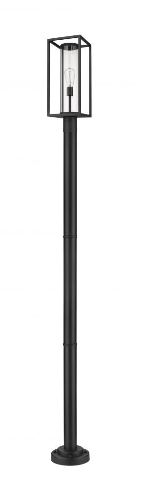 Cast a glow along a pathway with this modern outdoor post mounted fixture from the Dunbroch collection. Featuring a sleek, tall post and rectangular lantern with an airy, open silhouette, this outdoor light fixture can illuminate surrounding yards and landscapes. With a dark black aluminum frame and a single light set inside a clear glass cylindrical globe, this contemporary post mounted fixture lends a stylish look to any outdoor veranda or patio entertainment areas.