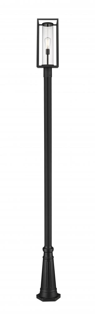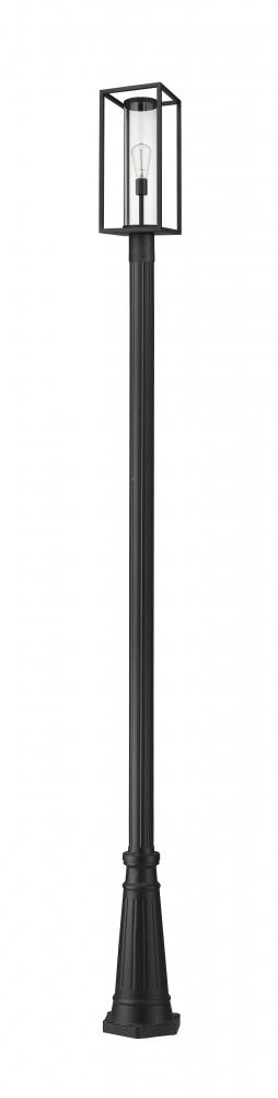 Illuminate a footpath with this contemporary outdoor post mounted fixture from the Dunbroch collection. Featuring a tall, slender post topped with an open and airy, rectangular aluminum lantern, this outdoor fixture casts adequate lighting across spacious patios and surrounding landscapes. With a dark black frame finish and a single light set inside a clear glass globe, this post fixture lends a stylishly modern vibe to outdoor entertainment areas.