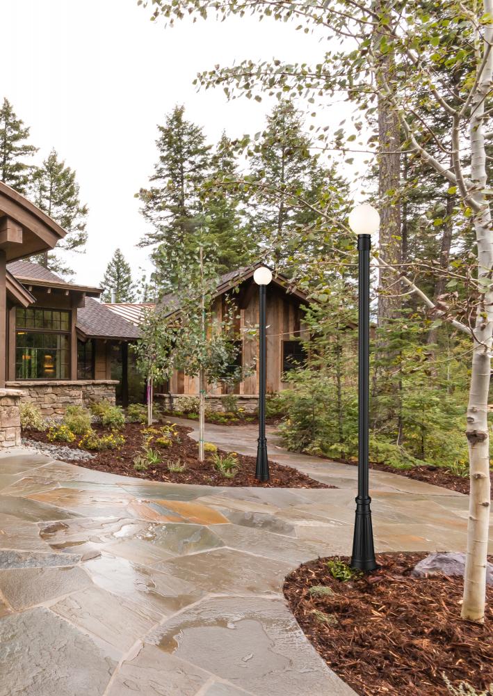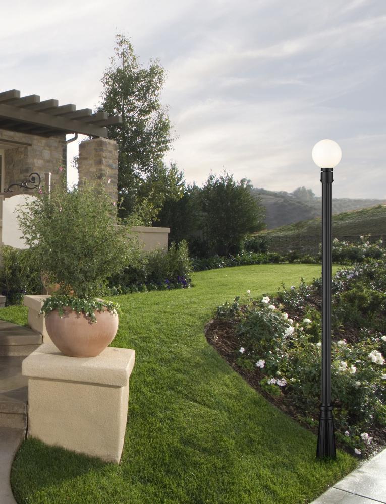 From the Laurent collection comes a decorative exterior light that completes an attractive outdoor setting with a dose of Mid-Century Modern style. This one-light outdoor post mounted fixture maintains a simple palette of black and white with a black finish aluminum post and a petite opal glass globe. Ornate artistry on its post base creates proportionality and offers an olde town village feel.