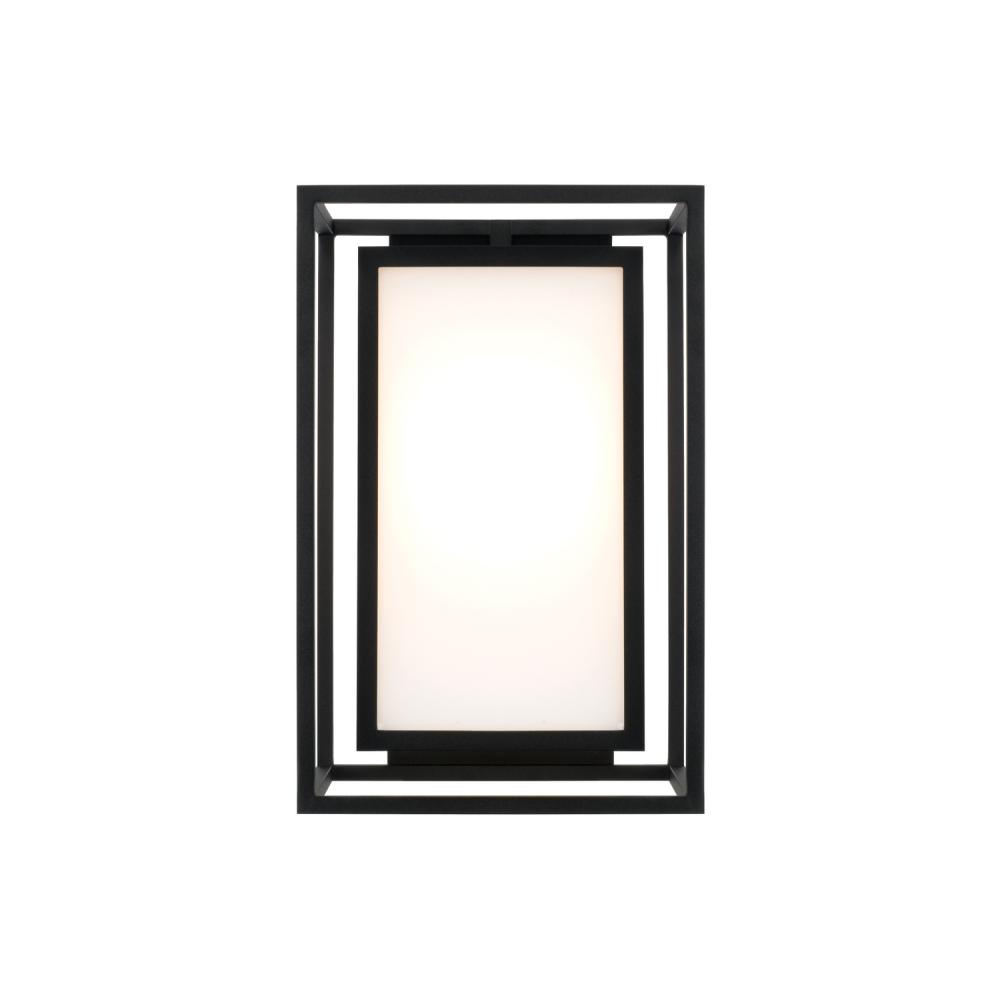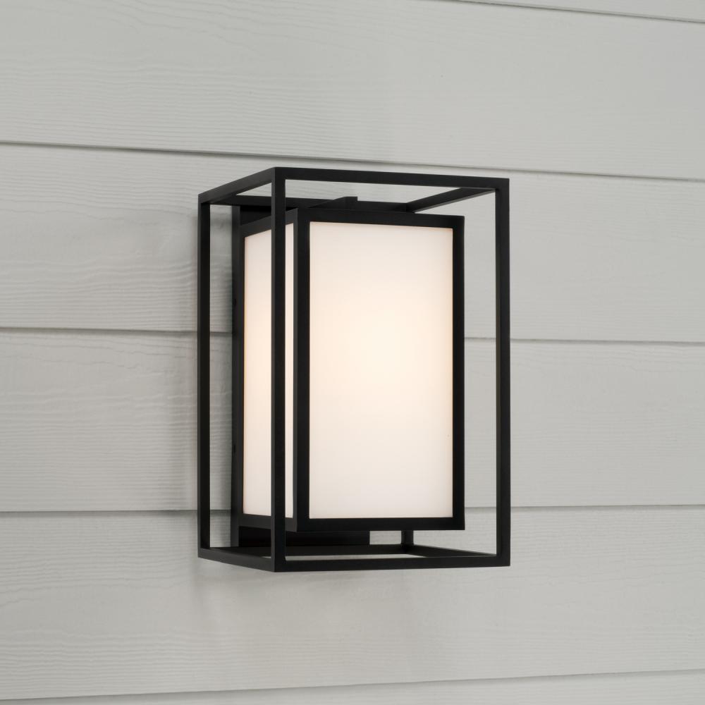 Neat and contemporary, the Aiden Outdoor Wall Lantern creates the illusion of floating light with inner and outer rectangular forms. The Soft White glass panes cast a warm glow to perfectly complement the squared silhouette, while the Black finish delivers a distinct aesthetic. Part of our Rain or Shine Series and backed by our five-year warranty.