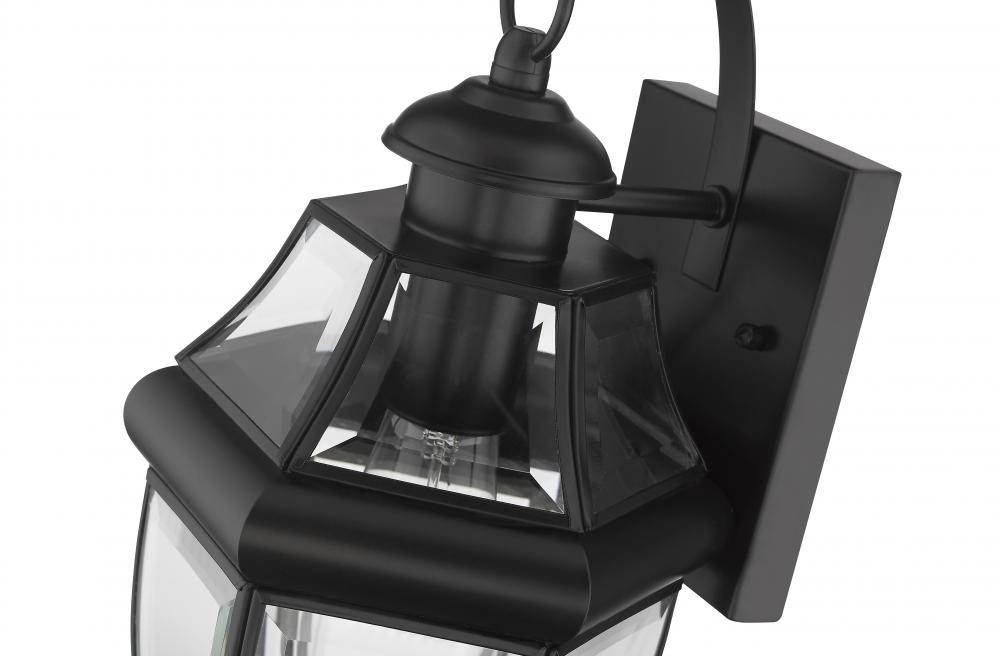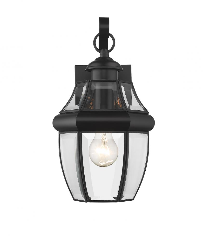 This one-light lantern-style outdoor wall sconce adds a classic silhouette to the lighting in your patio, deck or porch area. With its one robust bulb, the sconce provides soft, effective illumination. A multi-sided clear beveled glass shade has a black steel frame, creating an elegant impression.