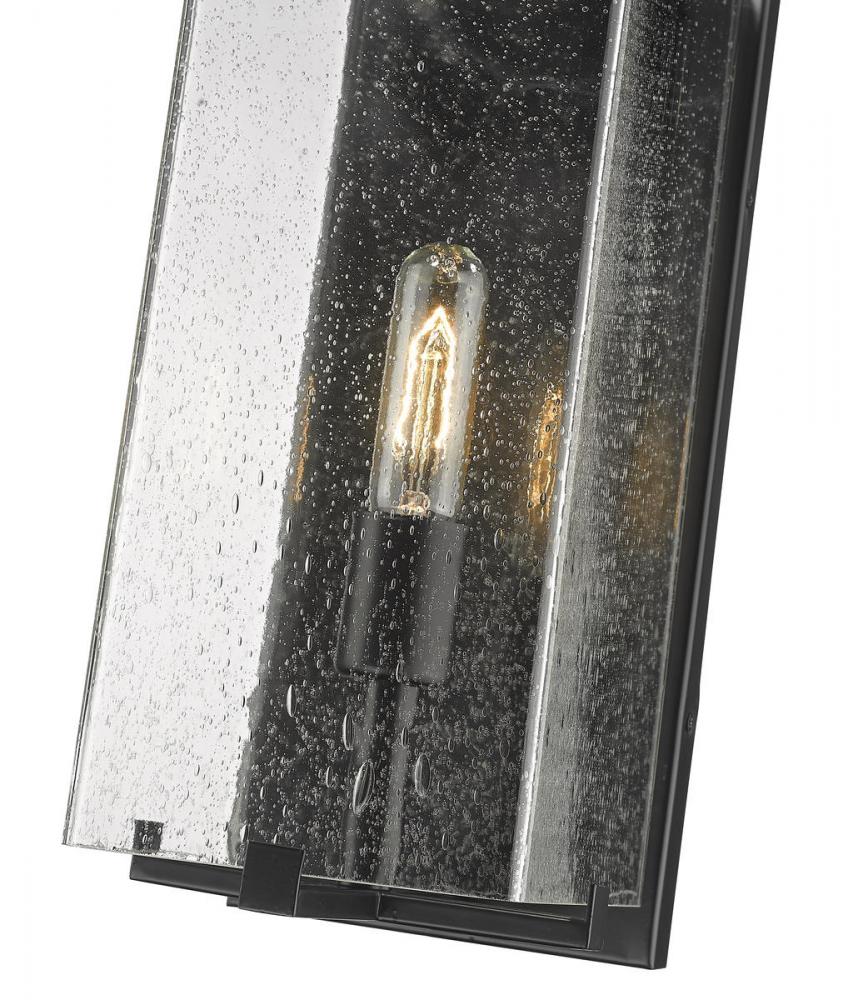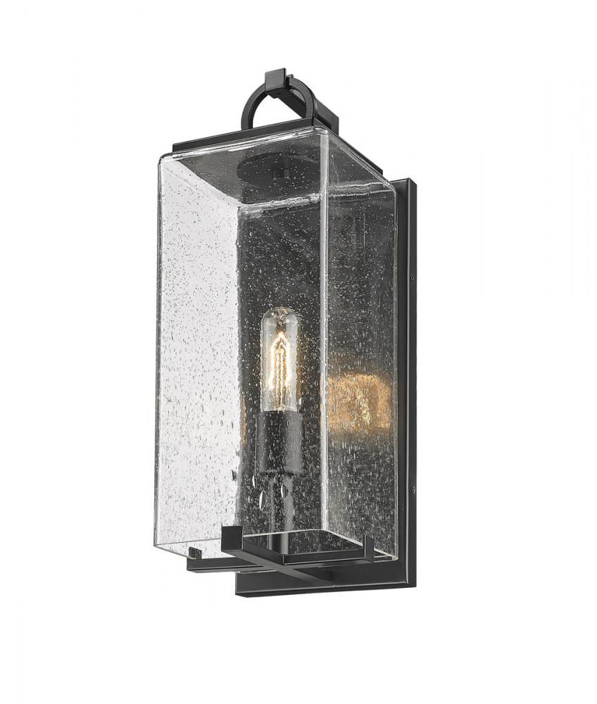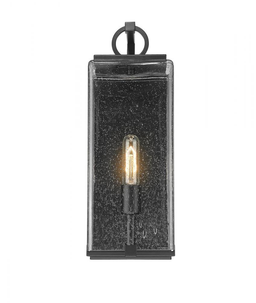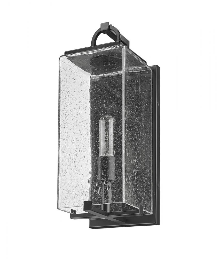 A lovely lantern-inspired silhouette leads to a one-light outdoor wall light thats suitable for contemporary or coastal exterior decor. Finished in black, this piece features candelabra style bulbs and a seedy glass shade for visual appeal.
