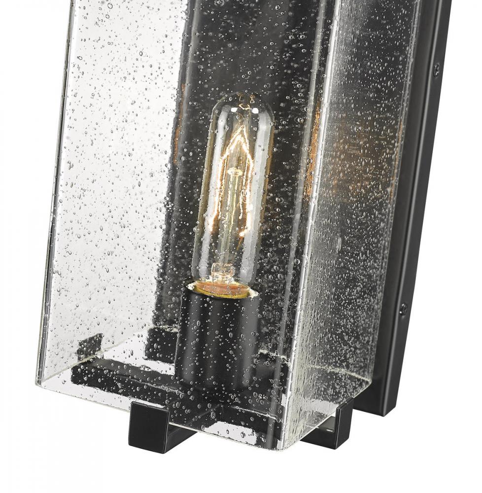 Light up your outdoor space with this coastal outdoor wall sconce with a lantern-like silhouette. This fixture features a black finish and seeded glass shade with candelabra bulbs. Feature this wall sconce on your deck or patio for immediate illumination.