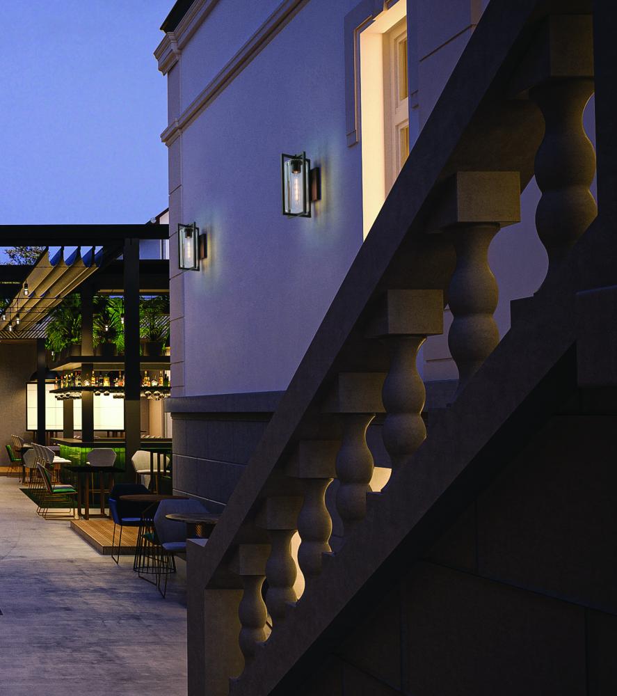 Clean lines intersect, offering a multi-plane dimensionality and turning this modern one-light outdoor wall light into a sophisticated way to illuminate a structure or patio space. A Coastal black paint finish inspires elegance matched by ribbed clear glass in a cylinder shade. This fixture is dimmable, delivering varying light levels.