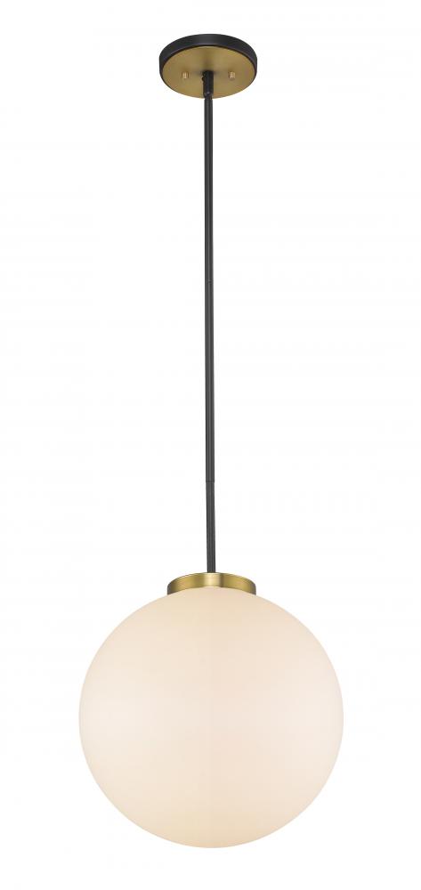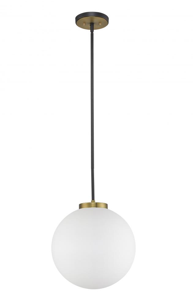 A slender design with clean lines is the hallmark of this one-light pendant for your home. Its fashioned with a matte black and olde brass finish and a large round opal shade for the warm glow youre looking for. This elegant light is perfect for the dining room, foyer, bedroom, or home office.