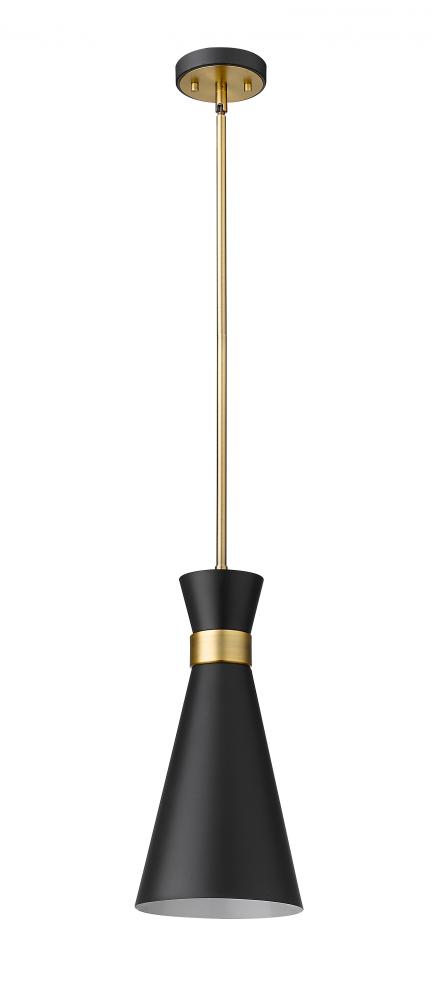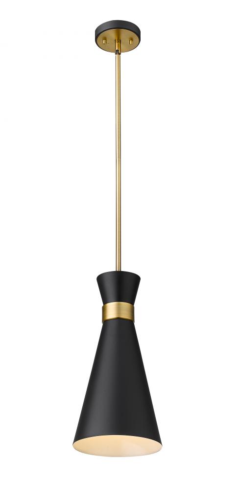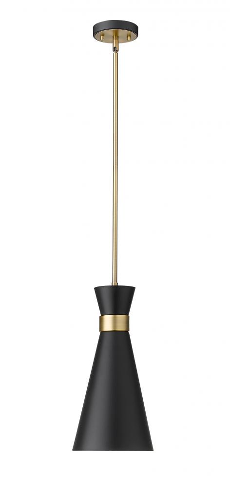 A decorative, slender silhouette shapes industrial influence that adds casual elegance to this matte black finish metal pendant light. Dress up a main living space or entryway with this tasteful fixture trimmed with heritage brass finish steel. This sleek pendant captures the heart of romantic industrial charm.