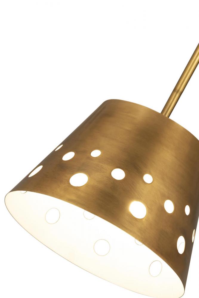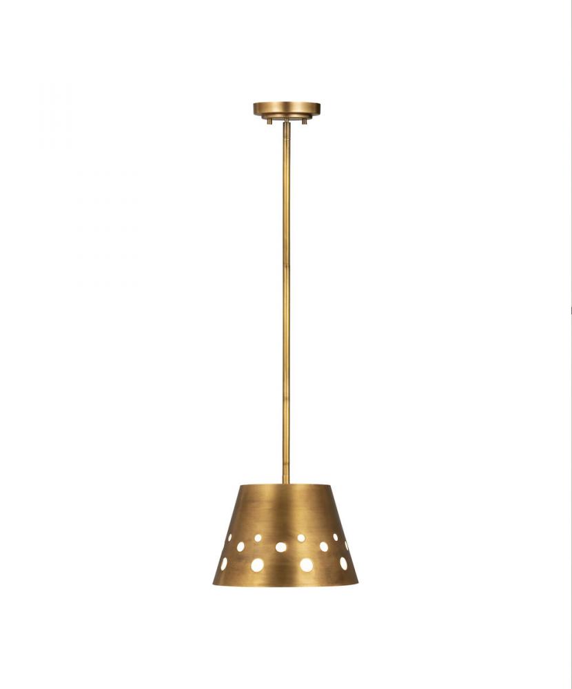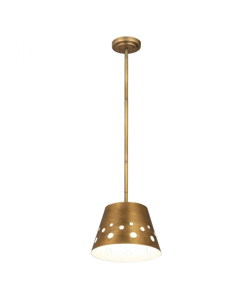The festive design of the Katie one-light mini-pendant offers inspiring attitude to dress up a casual space. Crafted of warm rubbed brass finish iron, this delightful fixture features a sleek conical shade with cutout holes that let light shine through. Punctuate a favorite dining space, kitchen, or nook with this pendant that offers adjustable hanging lengths and may be mounted on a sloped ceiling.
