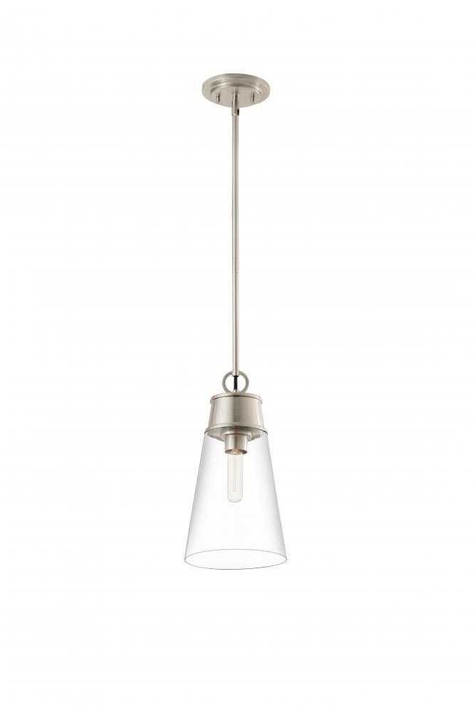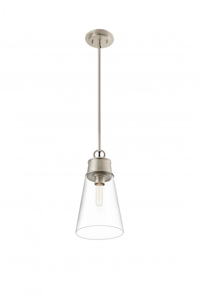 A slender silhouette forms enticingly clean lines that enhance the sophisticated look of the Wentworth single-light mini pendant. Bring targeted lighting to a nook or reading space with this elegant fixture fashioned of brushed nickel finish metal and a conical clear glass shade. An ideal choice for custom spaces, this pendant adds a signature design stamp to define personal taste.
