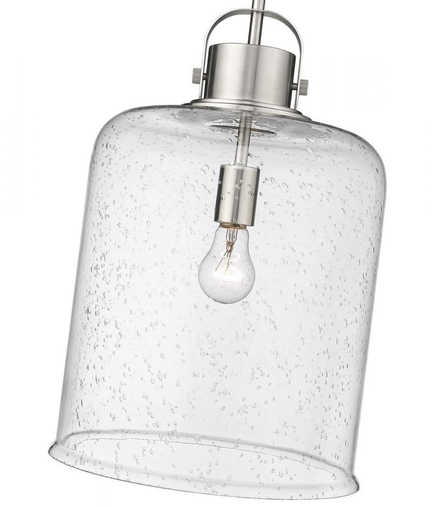 A modern take on a classic design, this brushed nickel pendant light will add illumination and style to kitchen islands, breakfast bars and more. The seeded glass shade is balanced by the cylindrical silhouette which elegantly diffuses the light and creates a soft glow.