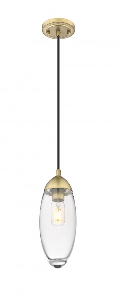 Simplicity takes a glam turn in the design of a decadent light fixture perfect for a variety of settings. This one-light pendant is fashioned for bridging old and new, featuring a linear down rod and canopy in warm rubbed brass finish iron. A romantic elliptical glass shade completes its delightful silhouette and provides versatility for complementing any d?cor scheme.