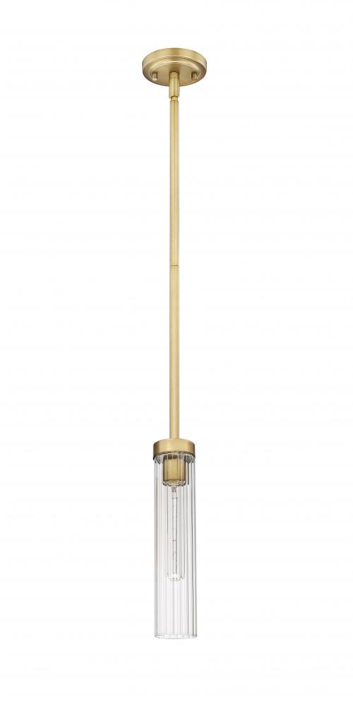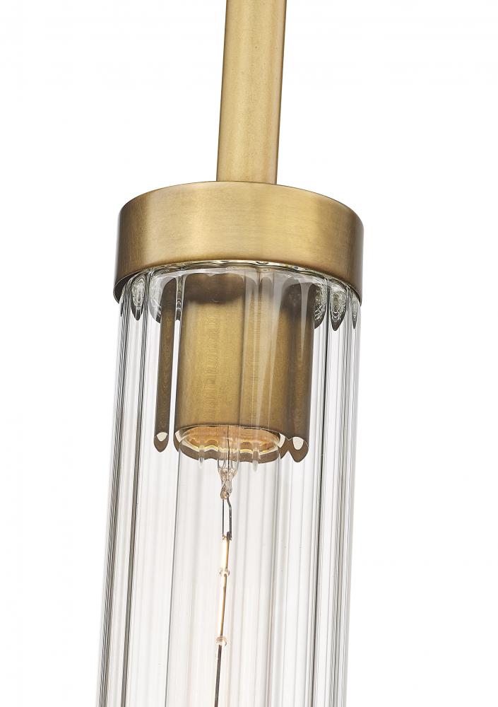 Warm, inviting style and finish effects add a sophisticated yet seamless look with a light fixture created to impress. This one-light pendant delivers a streamlined silhouette blending rubbed brass finish steel framing and accents with a charming clear glass cylinder shade, creating a vertical optical division. Choose this stylish pendant for illuminating a nook, living area, or foyer.
