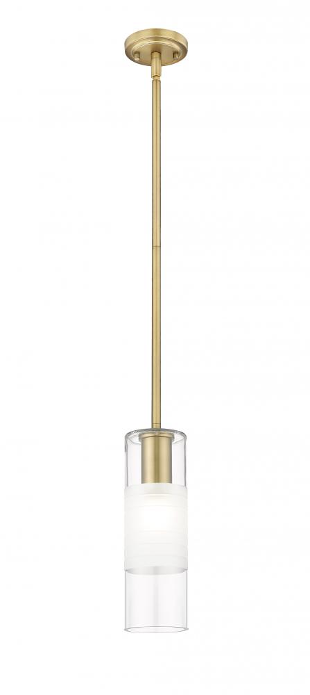 Artisan glass, arranged in a chic cylinder with frosted and clear elements, defines a modern one-light pendant. Designed for the Alton collection, it pairs a round canopy and robust housing, both in a rich modern gold finish over steel construction. Completing the look with a touch of texture is a braided cloth cord cover instills a tailored finishing touch.