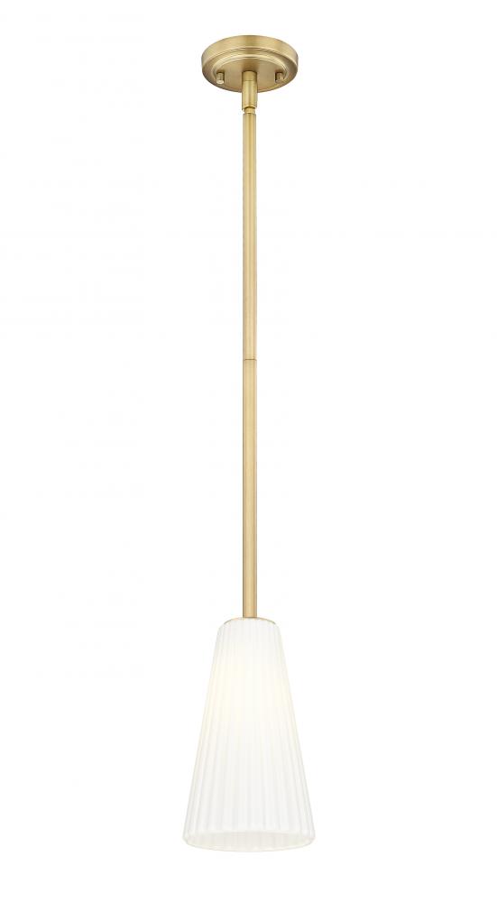 Frosted glass creates a sense of radiance when paired with a modern gold finish in this modern one-light pendant. Its a versatile size, complete with delicate fluting that adds movement to a conical shade. Alone or in series, its a gorgeous upgrade.