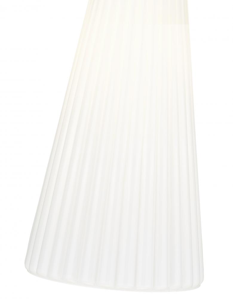 A rich modern gold finish creates a touch of warmth for a modern one-light pendant. Striking over a bedroom or living area, its a bold choice alone or in series to create a larger lighting installation. Its flared shade is crafted in frosted white glass, complete with fine fluting that creates the perfect hint of dimension and delicacy.