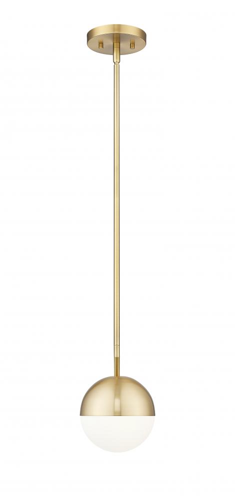 Capture the magic of a warm, rich modern gold finish on this mid-century modern one-light pendant. It blends contemporary angularity with vintage flair, creating a striking focal point alone or in multiples to create a larger installation. Its complete with an orb shade created with a metal shield and opal glass.