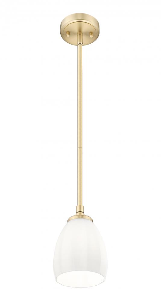 Punctuate a versatile interior with the refined style of a one-light pendant that captures a chic blend of classic and contemporary. Infused with subtle details, it features a domed-style shade of matte opal glass that ensures soft, diffused downlighting over a living or dining space. A modern gold frame finish is a perfect touch of warmth and vintage inspired sophistication.