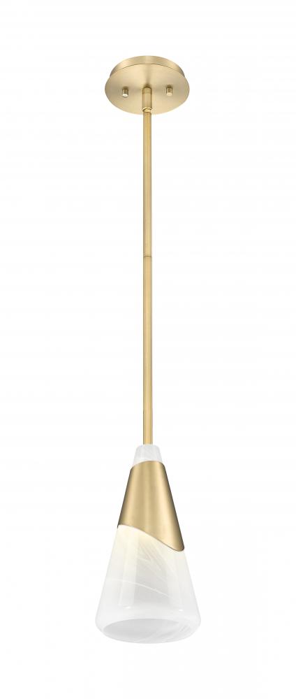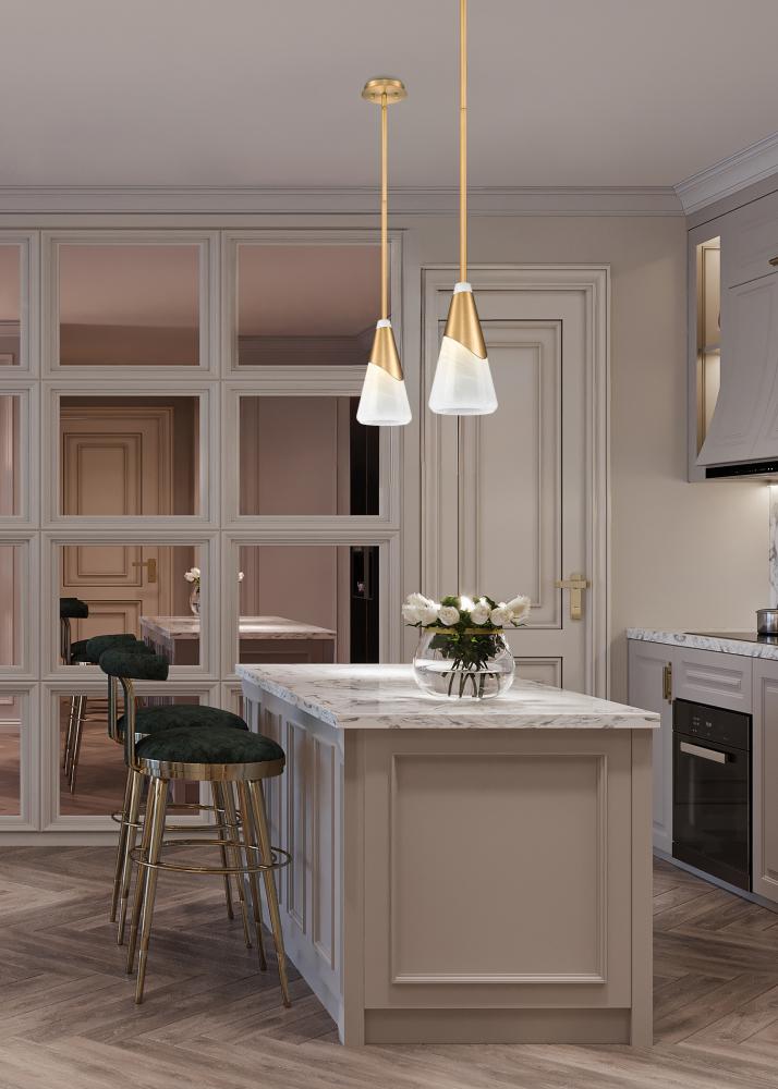 Infuse your space with a sense of sophisticated warmth with this modern one-light pendant design. A chic metal shroud takes center stage, wrapping around a conical shade of icy swirled artisan glass. It showcases a rich, warm modern gold finish that lends vintage influence and supreme elegance.