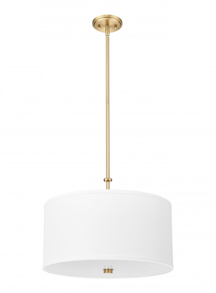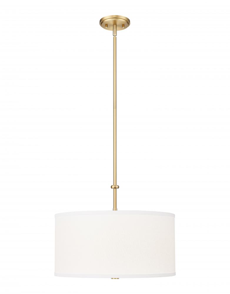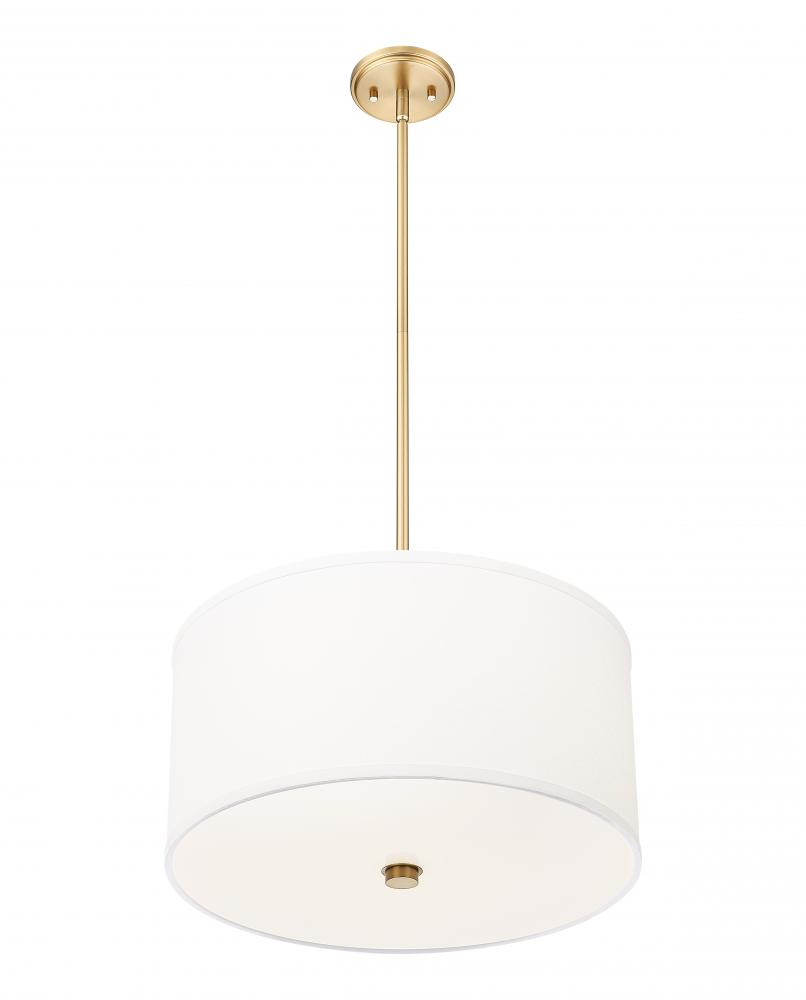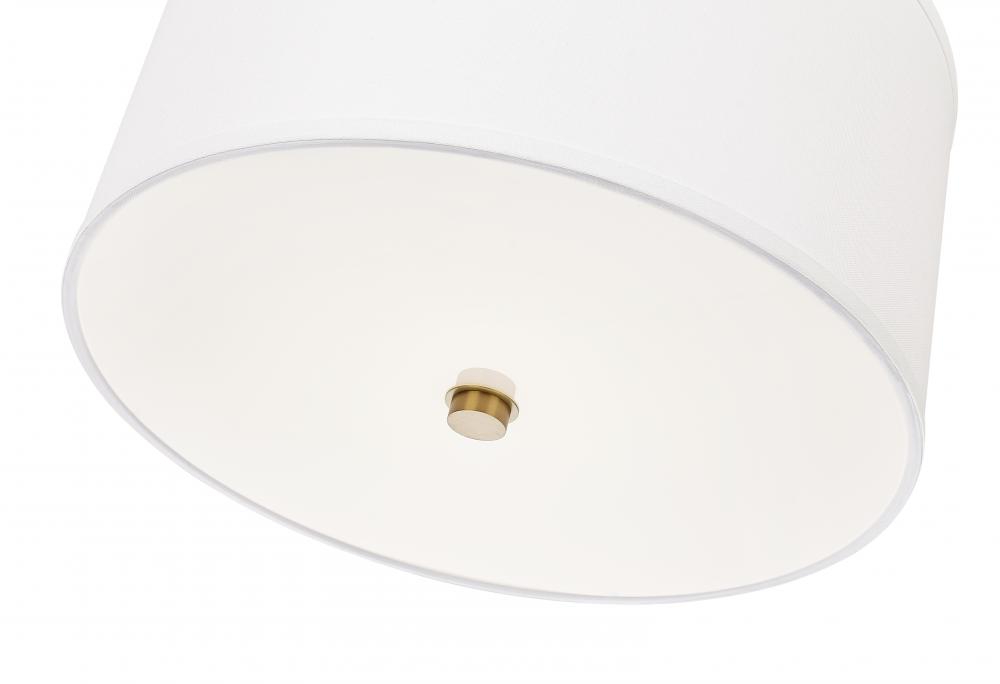 Embrace an iconic design in lighting with a single-light pendant offering plenty of versatility. A fresh motif blends modern gold finish steel framing with a fabric drum shade, as light flows through a glass bottom diffuser. This LED-integrated light fixture is dimmable to customize lighting levels.