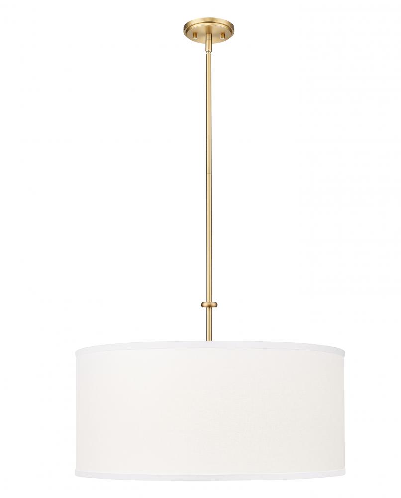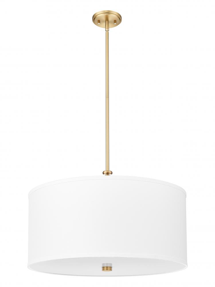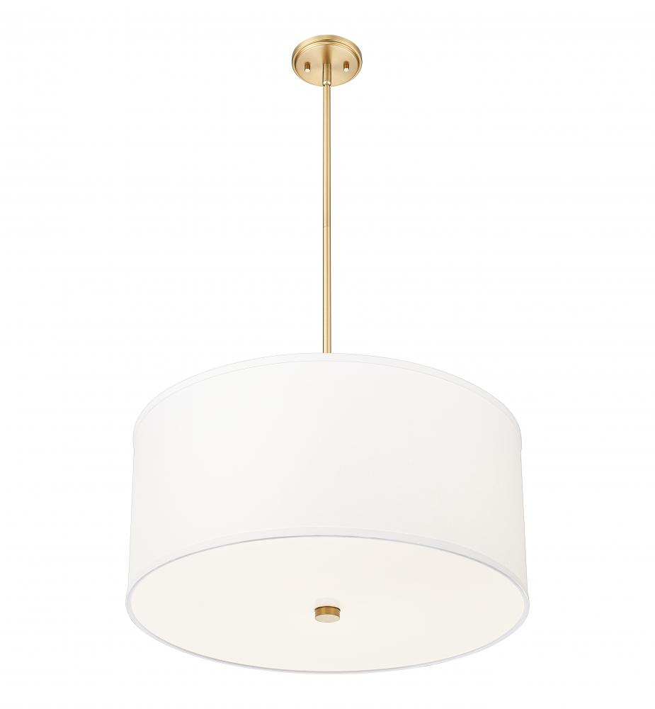 Choose this one-light pendant to merge with classic design schemes in living rooms, dining spaces, and foyers. An iconic fabric drum shade reflects an elegant silhouette, with modern gold steel framing remaining relatively simple. LED lighting flows through a glass bottom diffuser, perfect for dimming features that change moods to match desires.