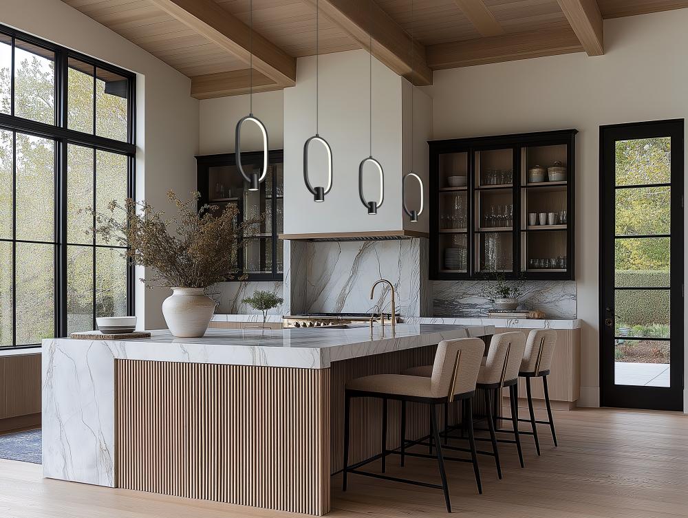 The innovative design of the Saros collection provides light color selectable, dimmable LED illumination along the elongated acrylic loop design as well as from individual downlights for an unparalleled amount of light. The illuminated loops can be ordere