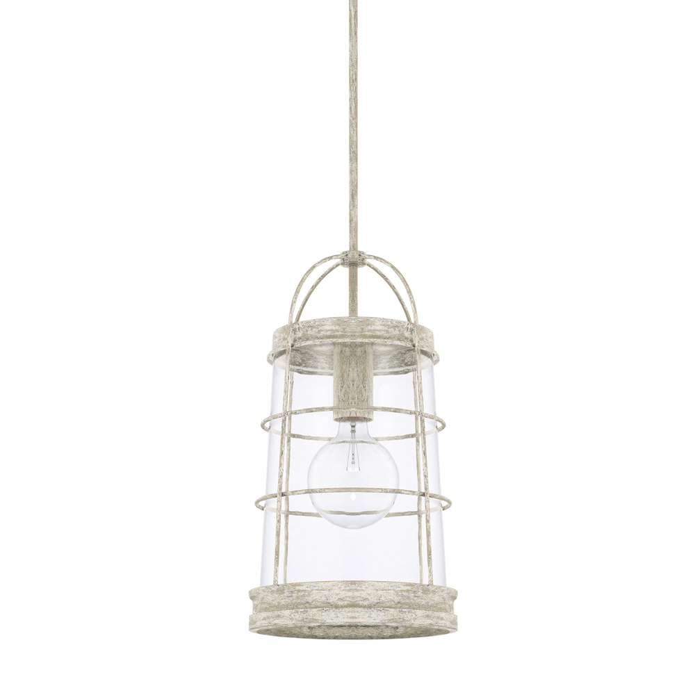 The Beaufort 1-light large pendant combines a distressed, hand-painted Mystic Sand finish with clear, tapered glass and a cage-like frame inspired by lighthouse lanterns. Designed to evoke coastal styling, this pendant light adds character to a beach-inspired setting and is perfect for accent and task lighting in the kitchen, dining room, bedroom or sunroom.