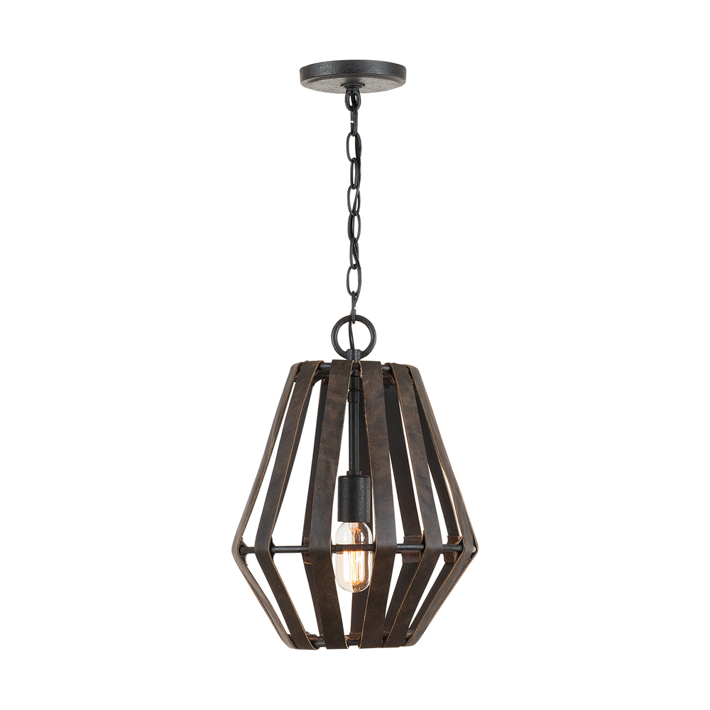 1 light pendant with Rustic Iron finish. Real leather straps lend a dash of modern, masculine vibes to this pendant perfect for a man cave, home bar or den.