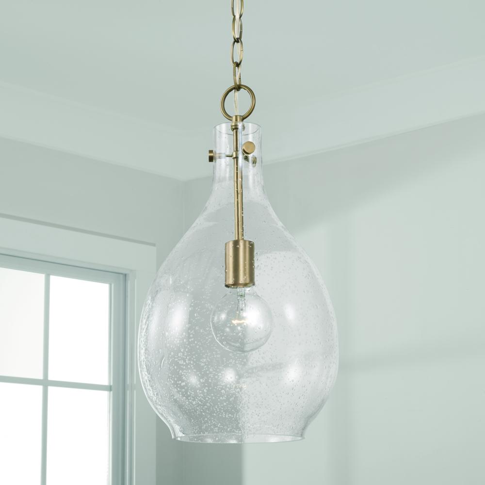DETAILS: Available in three finish options of Aged Brass, Brushed Nickel, or Matte Black for style versatility. Clear Seeded Glass in a teardrop shape is hand-blown. Slight variation may occur.