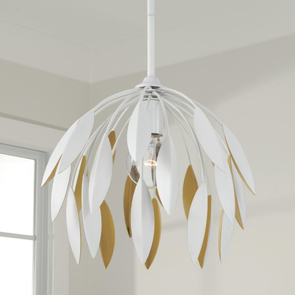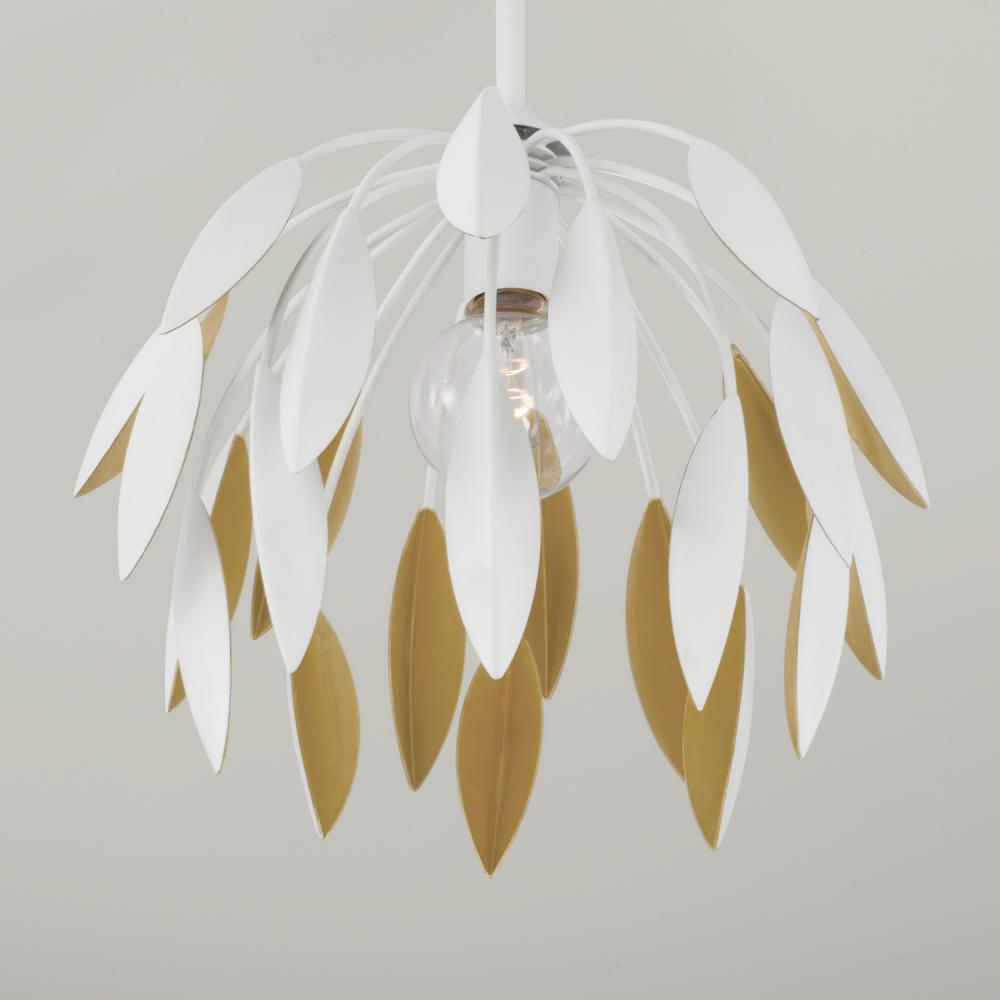 Whether hung as a pendant or semi-flush, the Margeaux Dual Mount brings the glamour. Layers of cascading leaves create decadent dimension, while the Matte White finish with Buffed Gold interior invites visual intrigue from every angle.