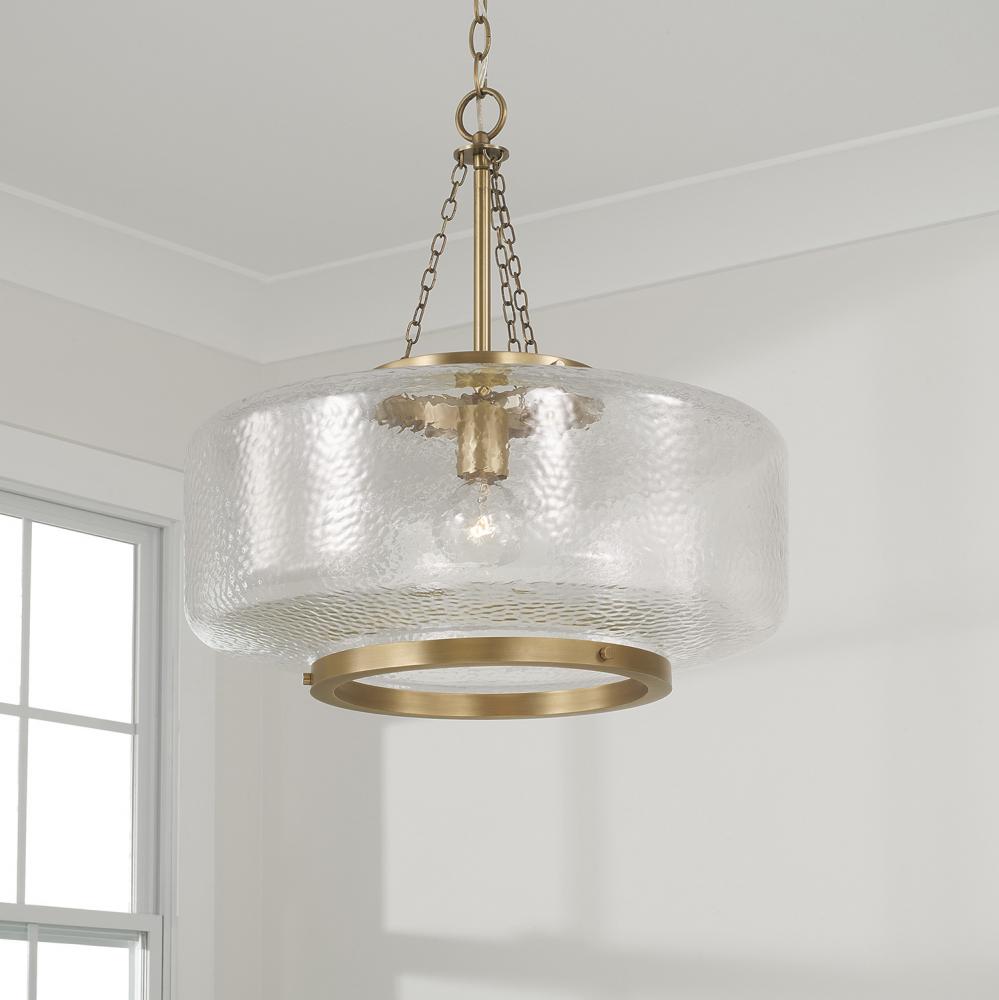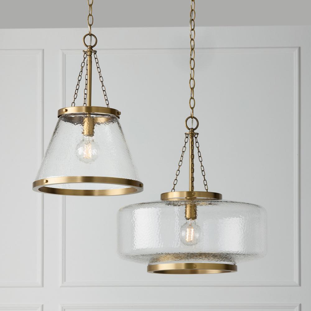 Illuminate stunning style in any space with the Landon Cloche Pendant. Suspended from small chains, the organic ripple glass creates textural appeal that casts a unique glow, while the Aged Brass details perfectly complement the clear, captivating silhouette.