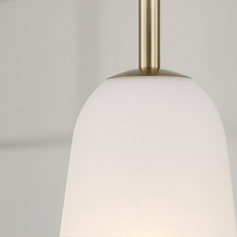 The Romy Pendant delivers transitional style with modern appeal. In an elongated tapered shade curved at the top, the Faux Alabaster glass gives a soft ambient glow. Finished in Matte Brass, this luminaire brings effortless sophistication to any space.