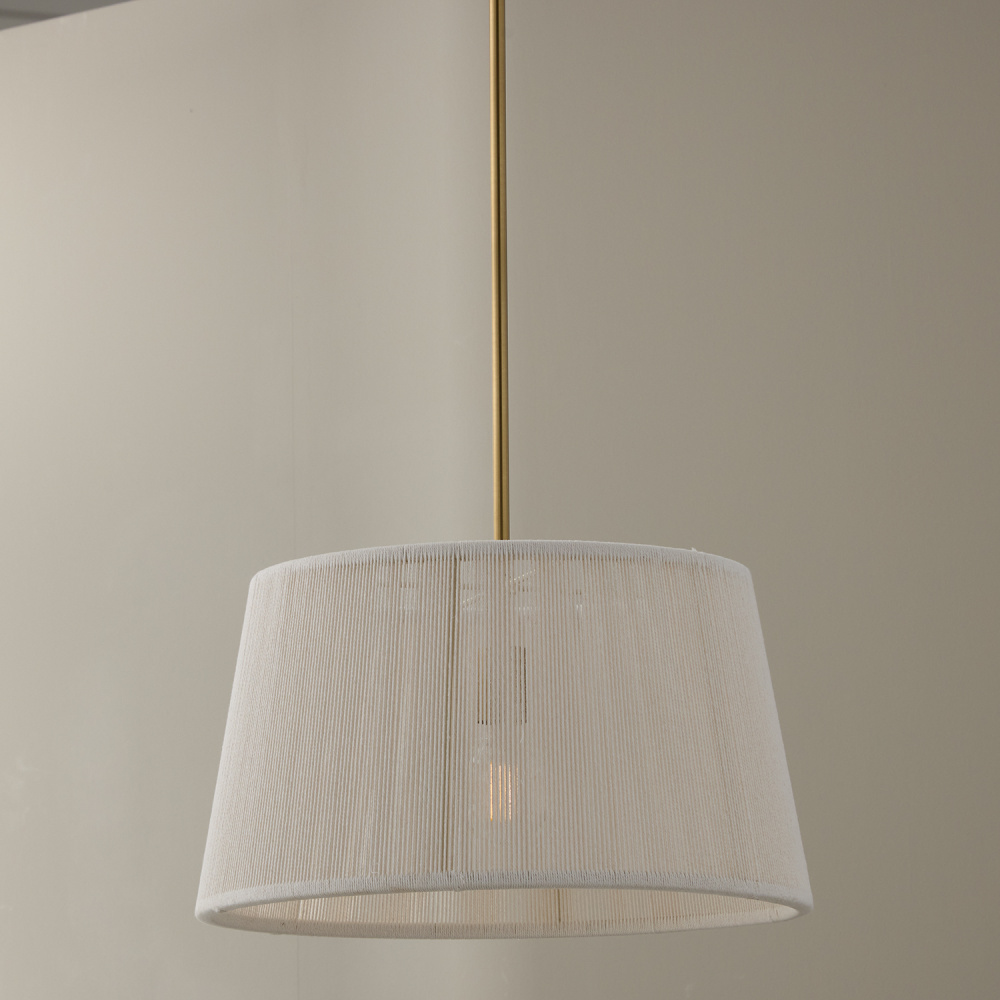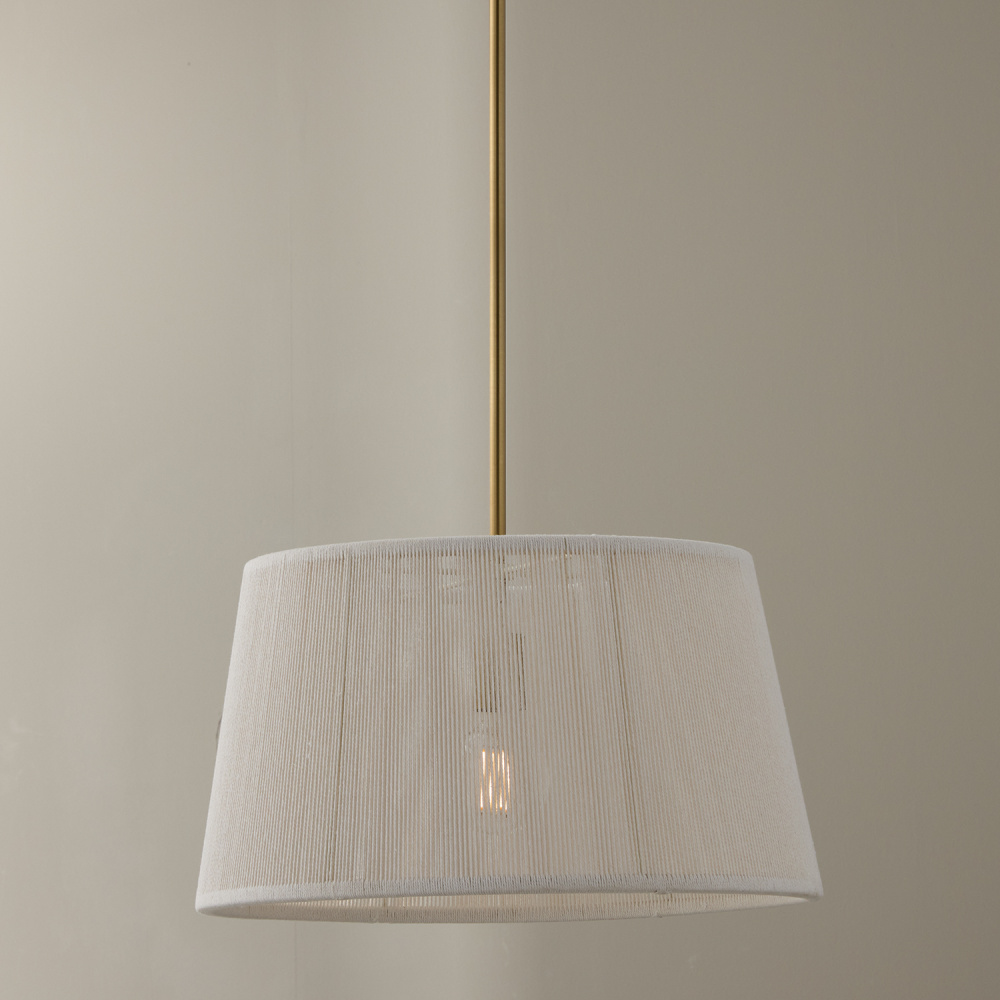 A casual twist on classic style, the Tara Medium Tapered Pendant seamlessly blends a timeless silhouette with hand-wrapped Bleached Natural Rope to create a visually soft, stunning luminaire. The Matte Brass finish adds a touch of warmth and shine.