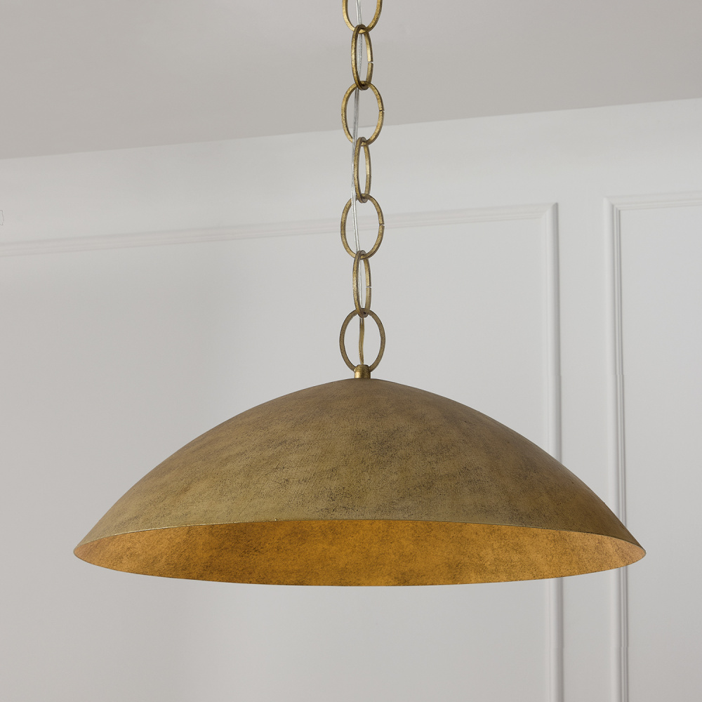 Sophisticated in silhouette and shine, the Francesca Medium Pendant brings high design and integrated LED technology. Soft curves form the unique designer dome, while the handcrafted Feathered Brass finish creates a luscious visual and tactile texture that beautifully catches the light from all angles. Complete with color changing technology — choose from three hues: 3000, 4000, or 5000 Kelvin.