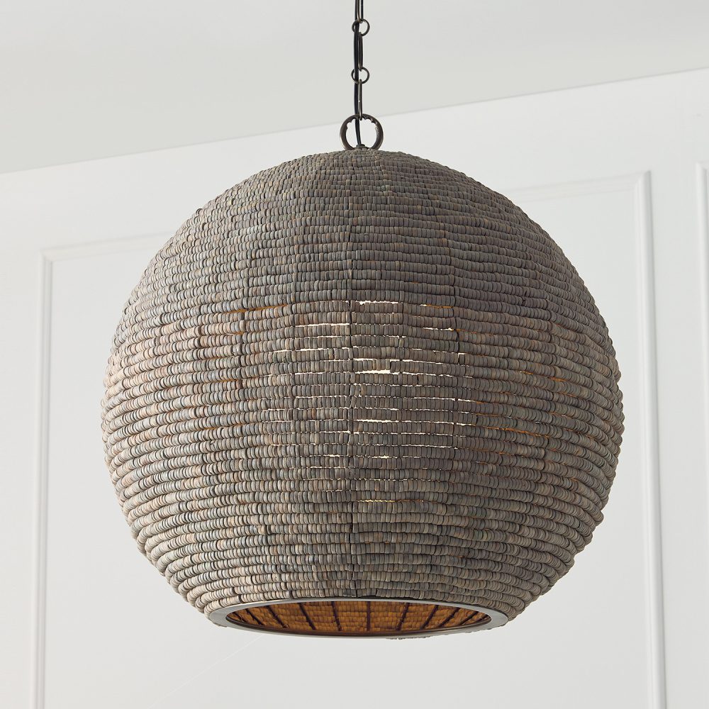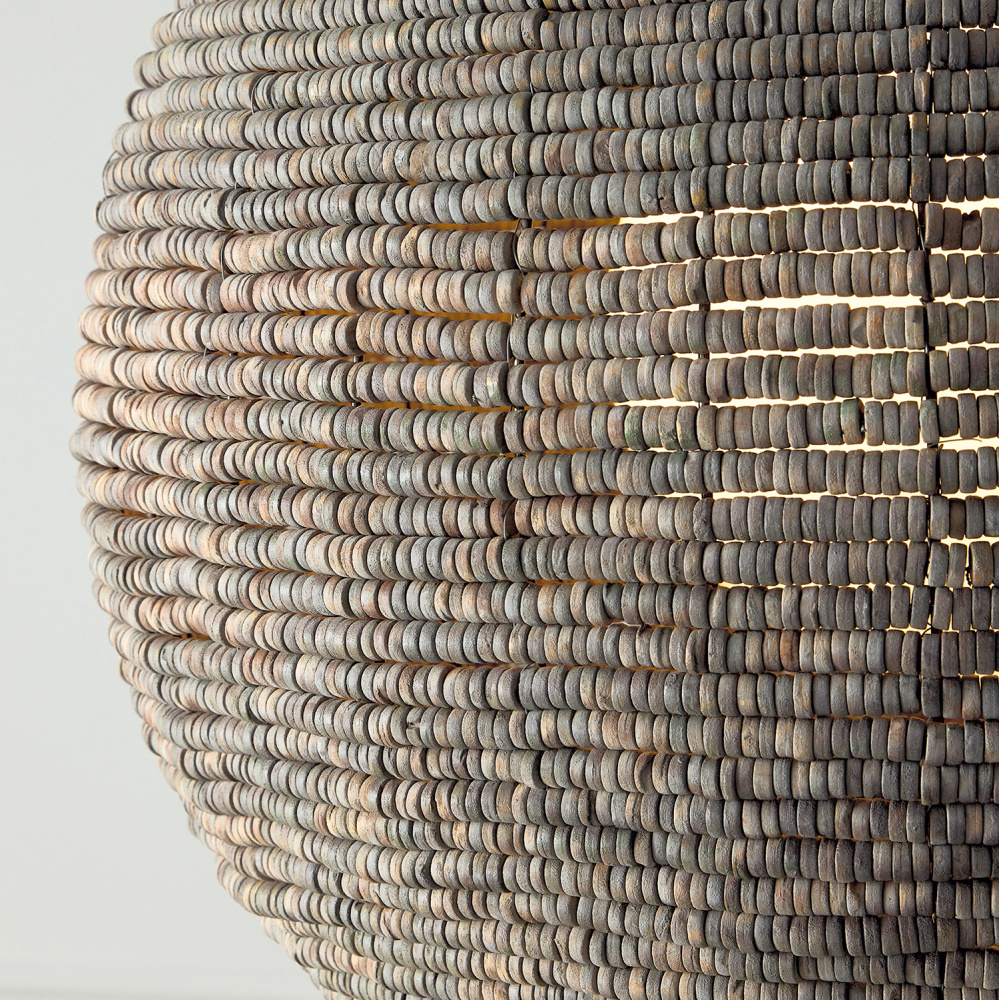 DETAILS: With thousands of hand-strung wooden beads, the open globe silhouette takes on a stunning dimensional appeal, complete with an inner Soft White glass globe and an Aegean Grey finish.