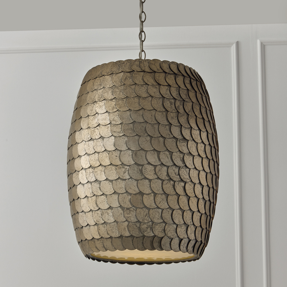 Handcrafted overlapping metal discs bring stunning texture to the Delphine 15 inch Medium Pendant. Each disc beautifully attracts the light in its own way, creating a sense of motion on the curved cylindrical silhouette. The Grecian Pewter finish adds visual dimension, while the real Alabaster diffuser illuminates a soft, natural glow.