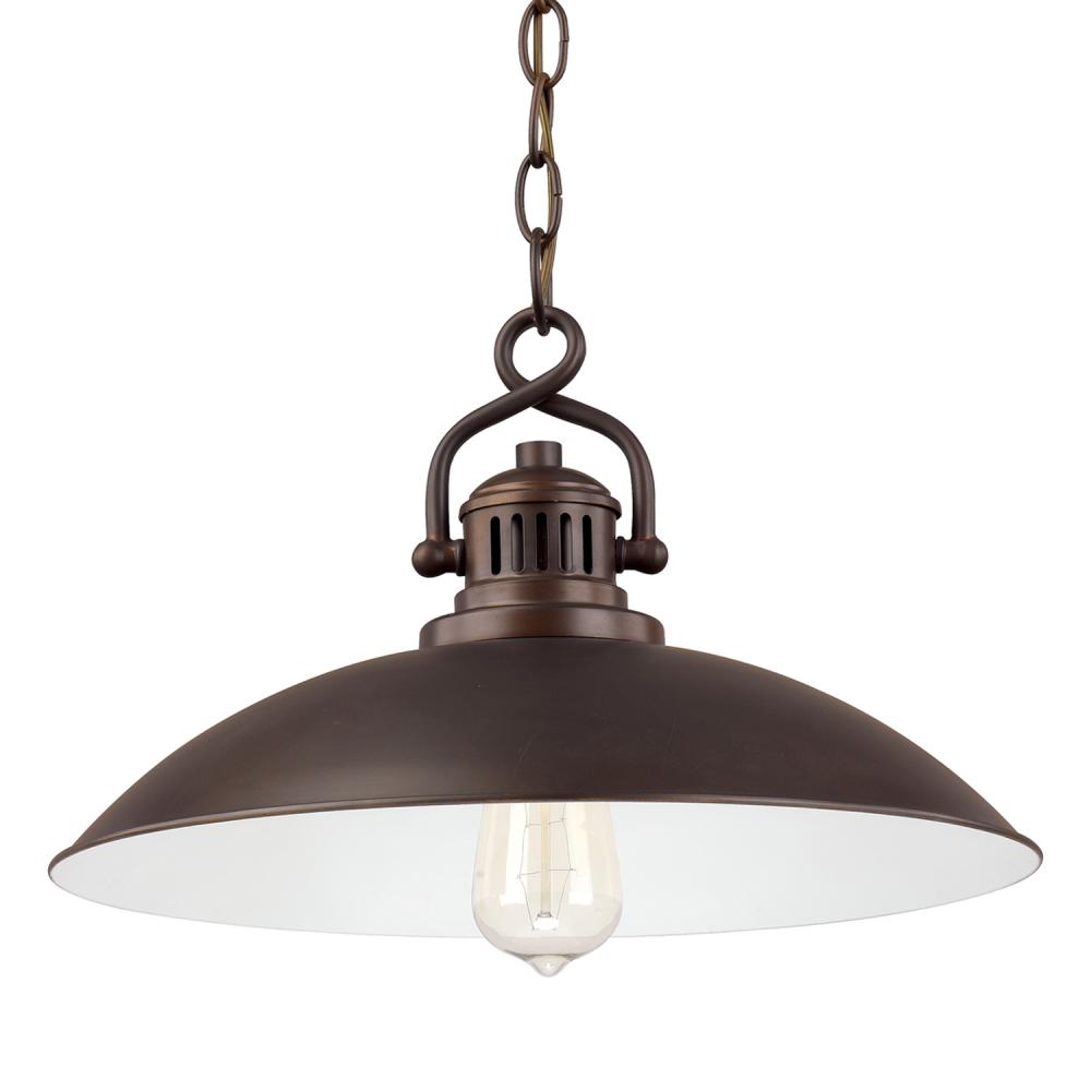 A metal domed shade and chain mount design gives our O'Neal 1-light pendant a hint of industrial style for classic homes. Finished in a rich Burnished Bronze, the shade has a painted white interior to enhance the look. Use a vintage-style bulb to play up the timeless style. Damp rated, it's perfect for use in kitchens and baths, as well as dining and living areas.