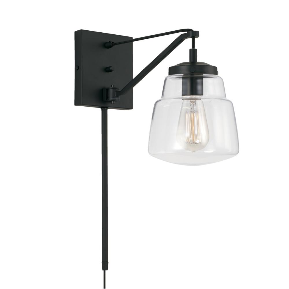With a fresh spin on diner-inspired glass, the Dillon 1-Light Sconce brings a refined retro vibe to any space. The Matte Black finish accents the pronounced rivet details and sculptural silhouette of the plug-in optional fixture.