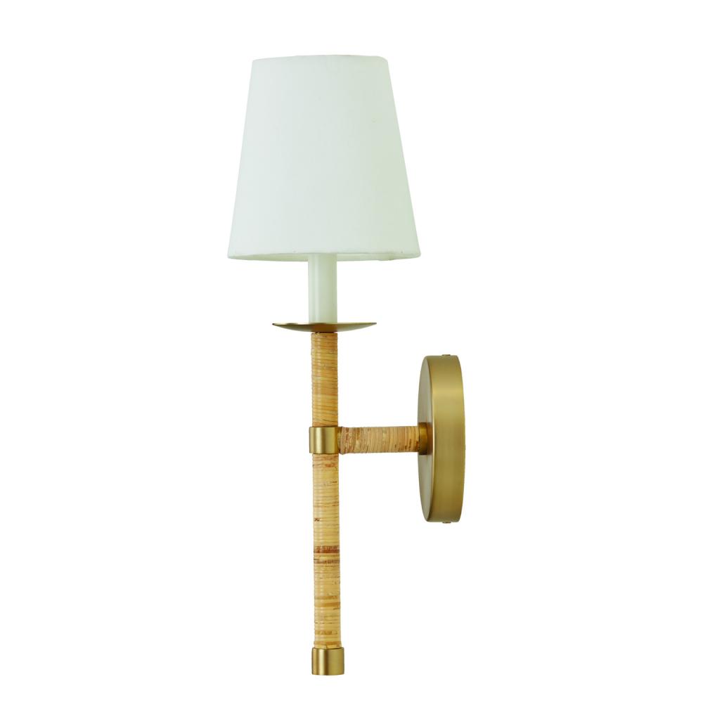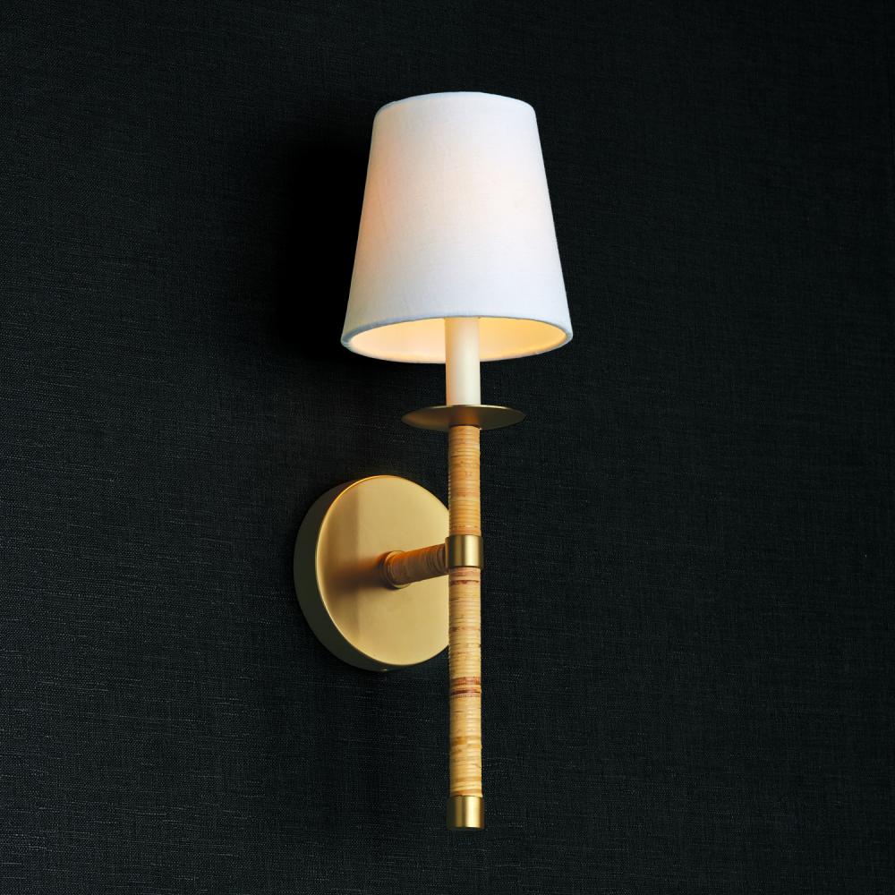 6"W x 18"H 1-Light Sconce in Matte Brass with Hand-Wrapped Natural Rattan and White Fabric Stay-Straight Shade