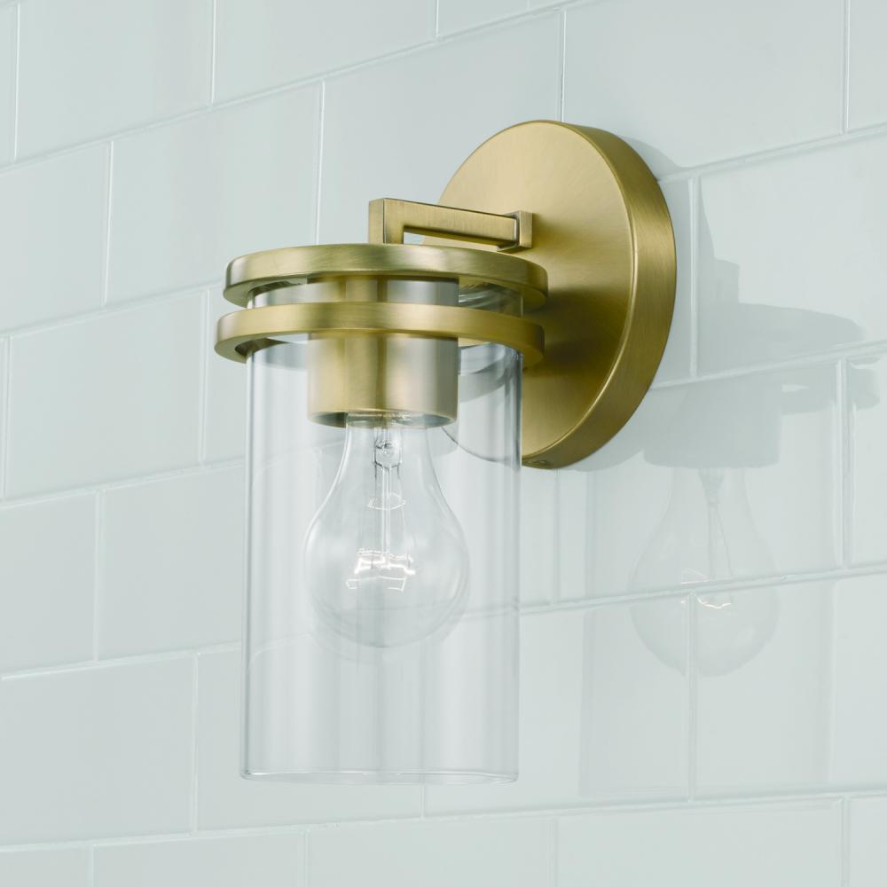 DETAILS: Clear glass cylinder and double ring accent is available in three finishes of Aged Brass, Brushed Nickel, or Matte Black for style versatility.