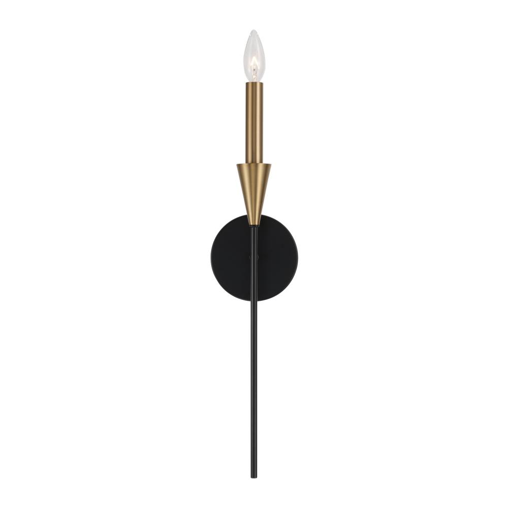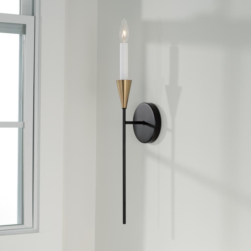 Spotlight striking elegance with the Avant Sconce. The pointed Aged Brass bobeche and elongated Matte Black stem evoke a stunning, distinct style, while the interchangeable Aged Brass or Matte White candle sleeve offers a tailor-made feel.