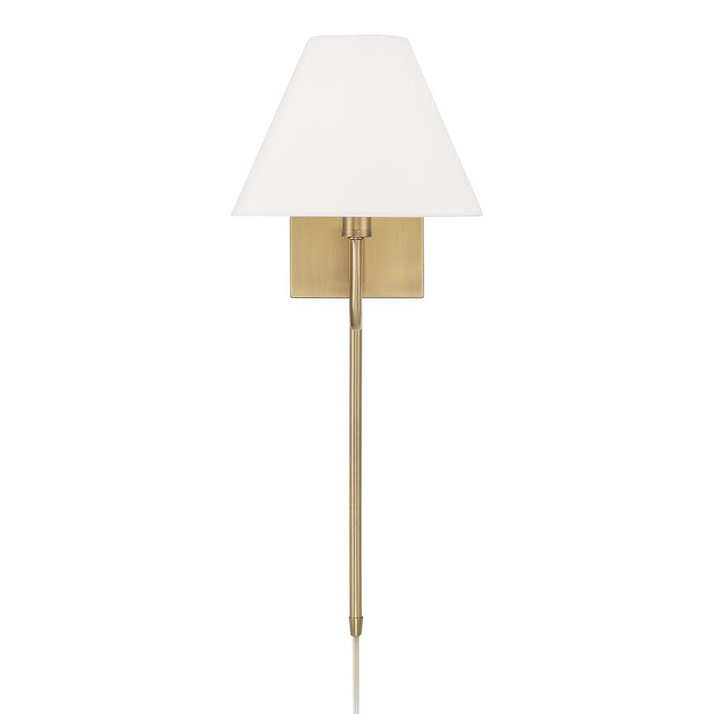 Soft angles and classic style create the Chadwick Sconce. The tapered White fabric shade brings a visual balance to the elegant, swiveling metal arm, finished in Aged Brass for a mid-century touch of shine. Includes a dimmer dial on the backplate and a plug-in option with 12 cord cover for effortless functionality.