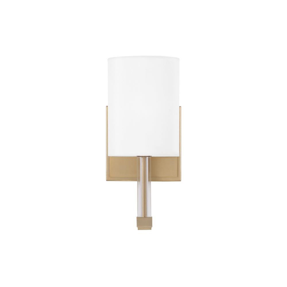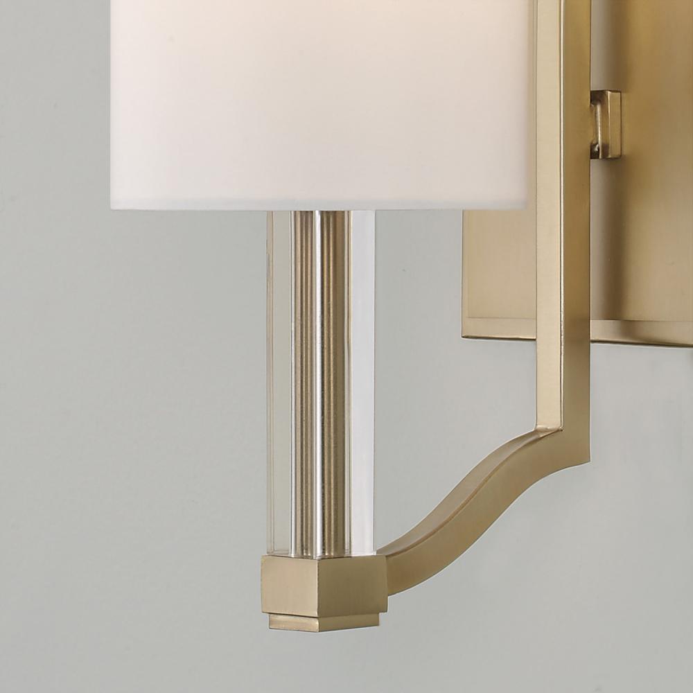 Blending transitional design with classic appeal, the Ingrid Sconce brings sophistication to any space. The Matte Brass arm curves slightly to meet the crisp acrylic candlesleeve, topped with a cylindrical White fabric shade for a neat, tailored look.