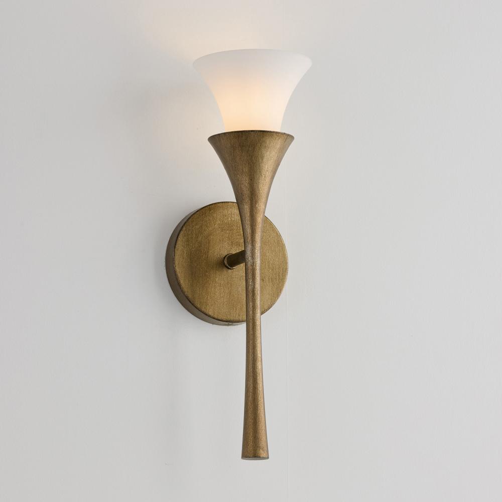 The Nola Sconce is a uniquely stunning luminaire in a classic candlesleeve design with a modern twist. Nestled into the flared silhouette, the Soft White glass detail casts a warm ambient glow against the rich, amber shimmer of the Mystic Luster finish.