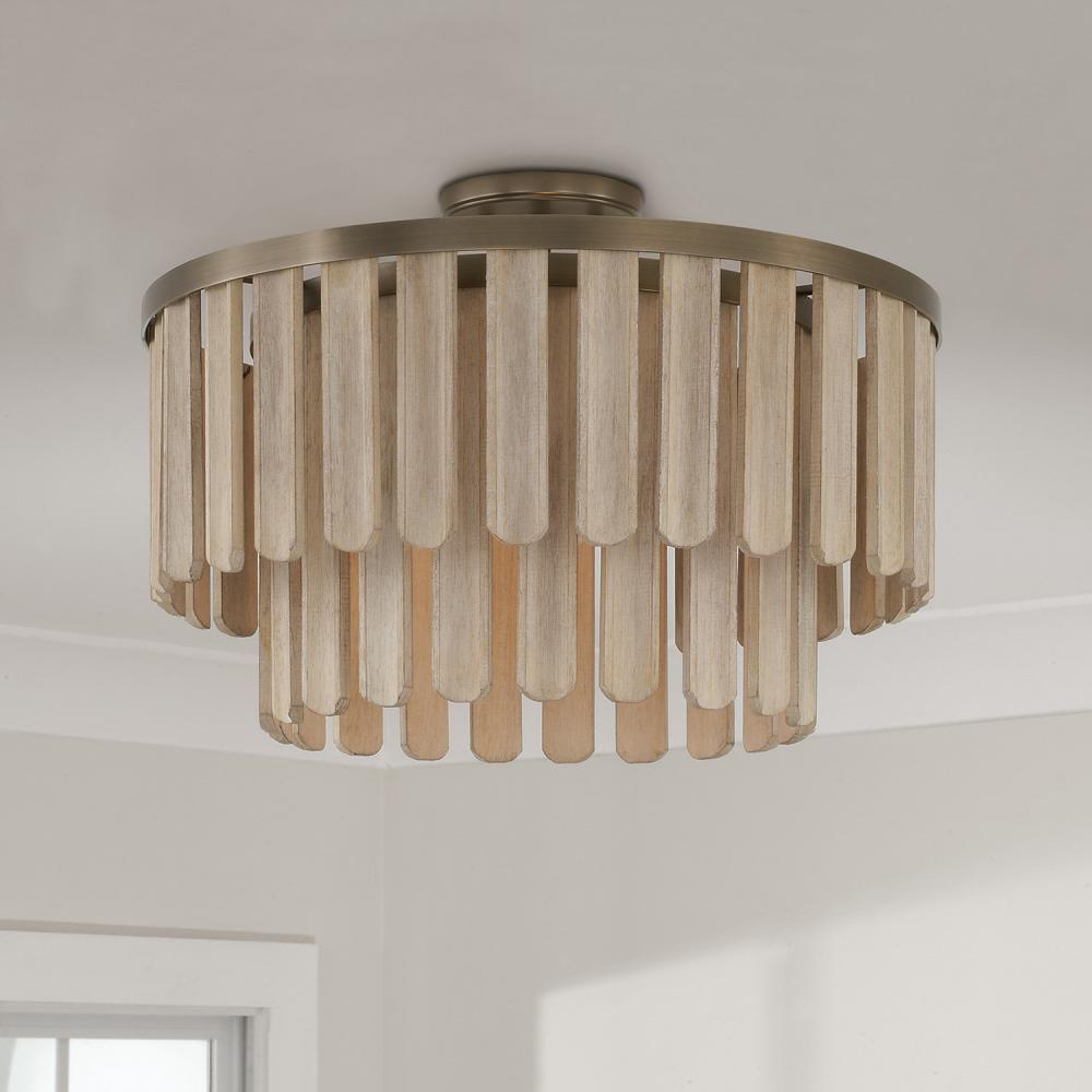 Handcrafted of mango wood, the Jada Dual Mount celebrates muted earthtones and modern organic style. The subtly distressed Nordic Grey wood adornments are carved to bring elegant texture and depth to the tiered form, complemented with the Dark Brass metal frame. Can be hung as a pendant or semi flush.